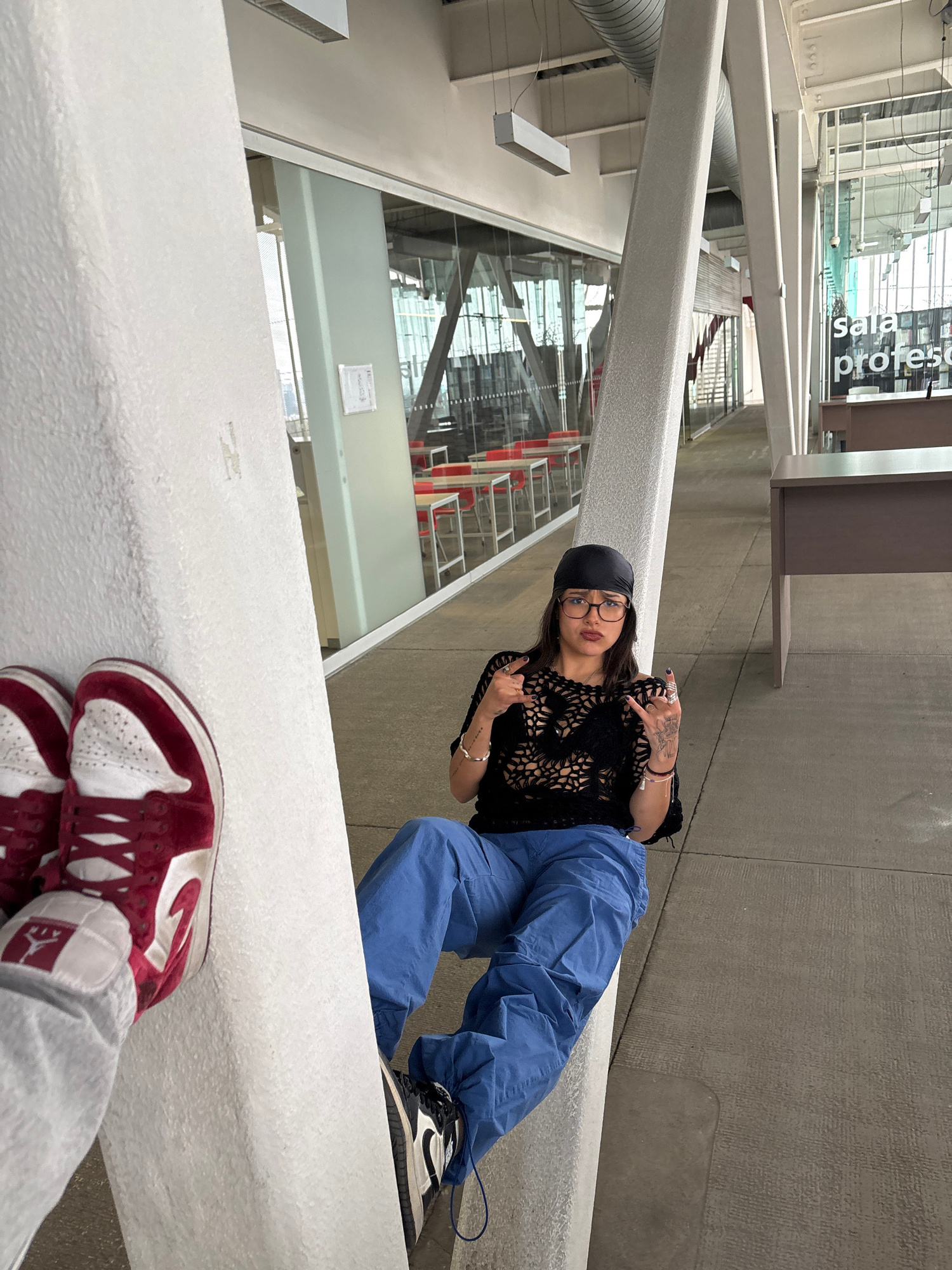 The image, rotated 90 degrees clockwise, presents a young person posing casually within a modern, industrial-style building interior, likely an educational institution in Mexico City, Mexico. The cen…read more