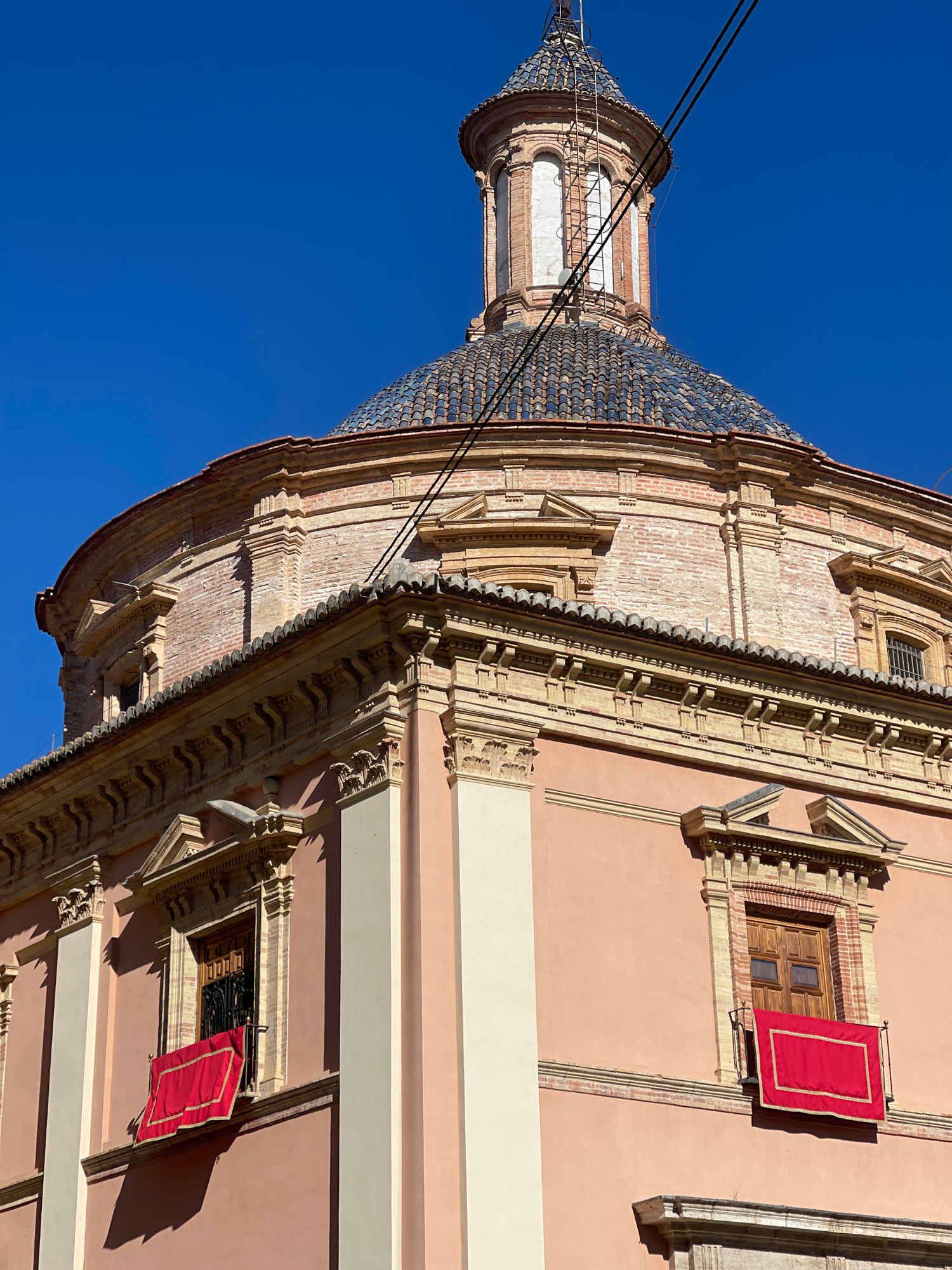 The image shows a portion of the Church of Santos Juanes in Valencia, Spain, seen from a low angle, looking upwards. The church's tiled dome is on the left, extending into a clear blue sky. The side o…read more