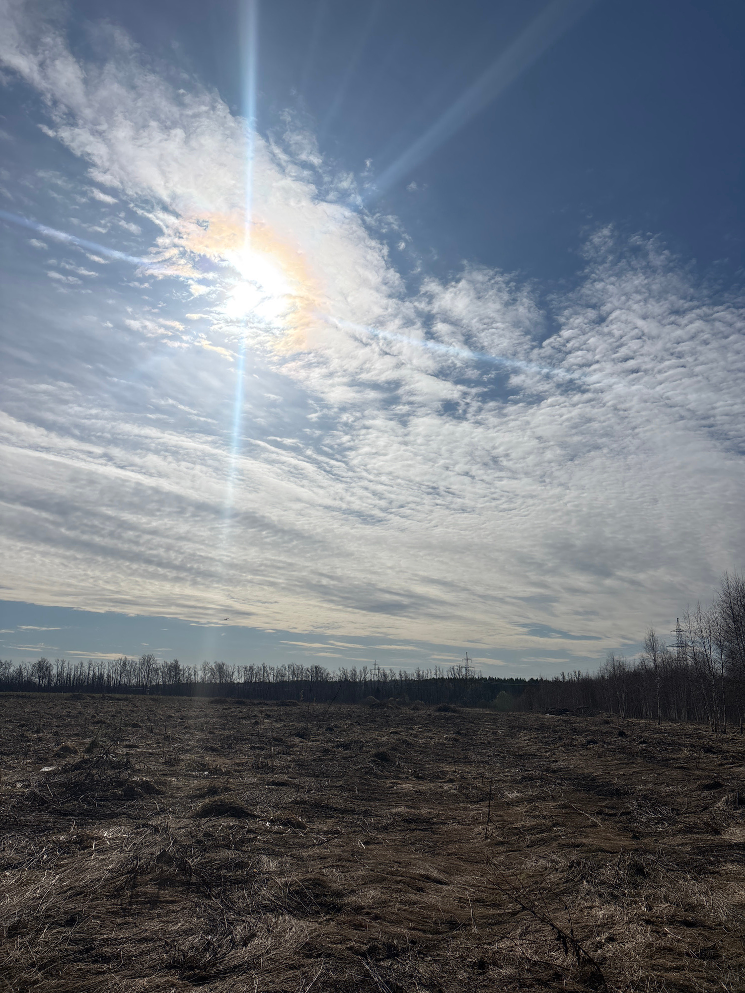 The image shows a landscape in Razdolye, Russia, under a partly cloudy sky. The sun is shining through the clouds, creating a bright glare. The ground is covered with dry grass and some bare trees. Po…read more