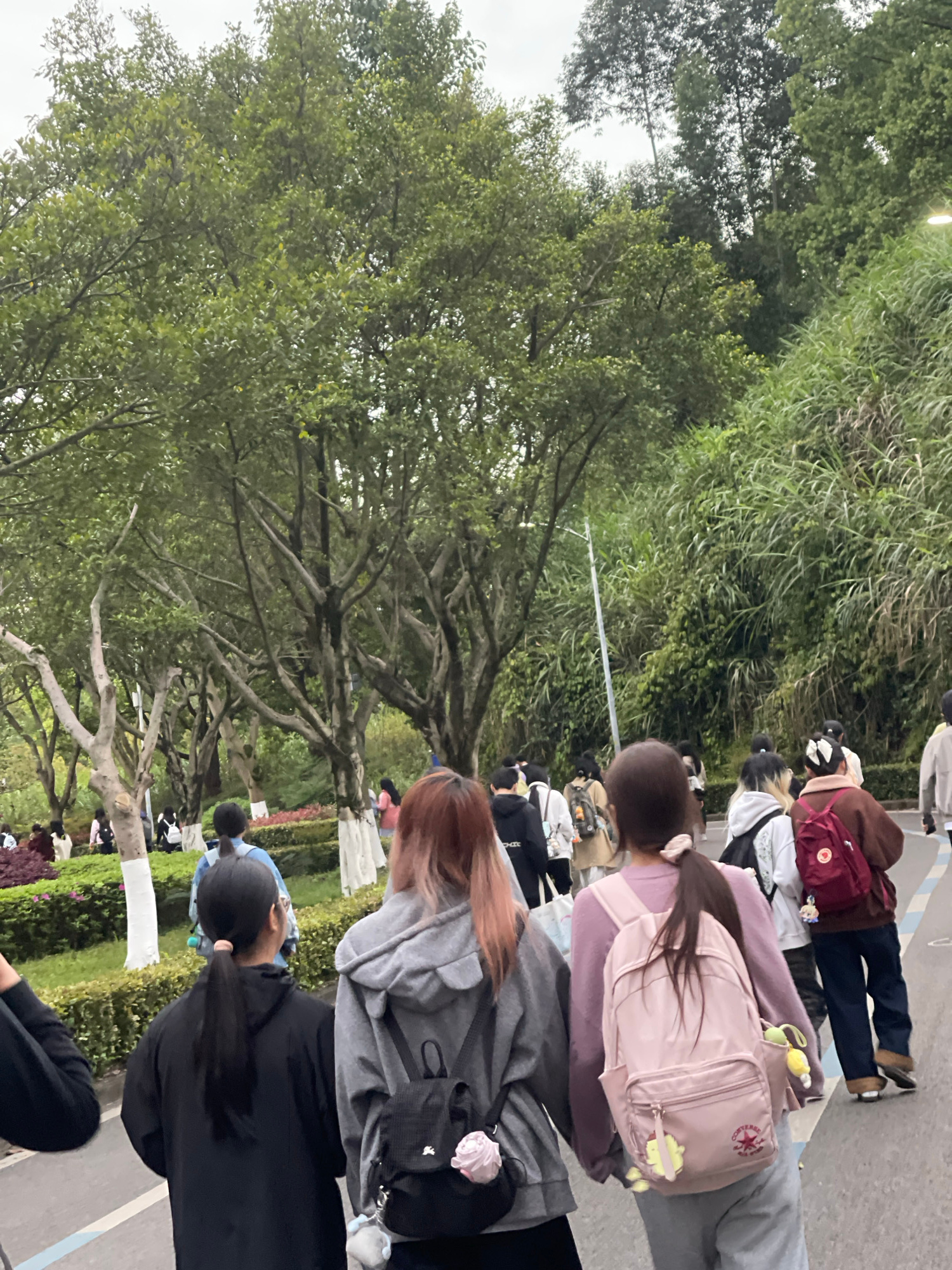 The image shows a line of people walking outside in Chongqing High-tech Zone, China. The people appear to be students. The background includes green trees and bushes. Some people have backpacks. A pav…read more