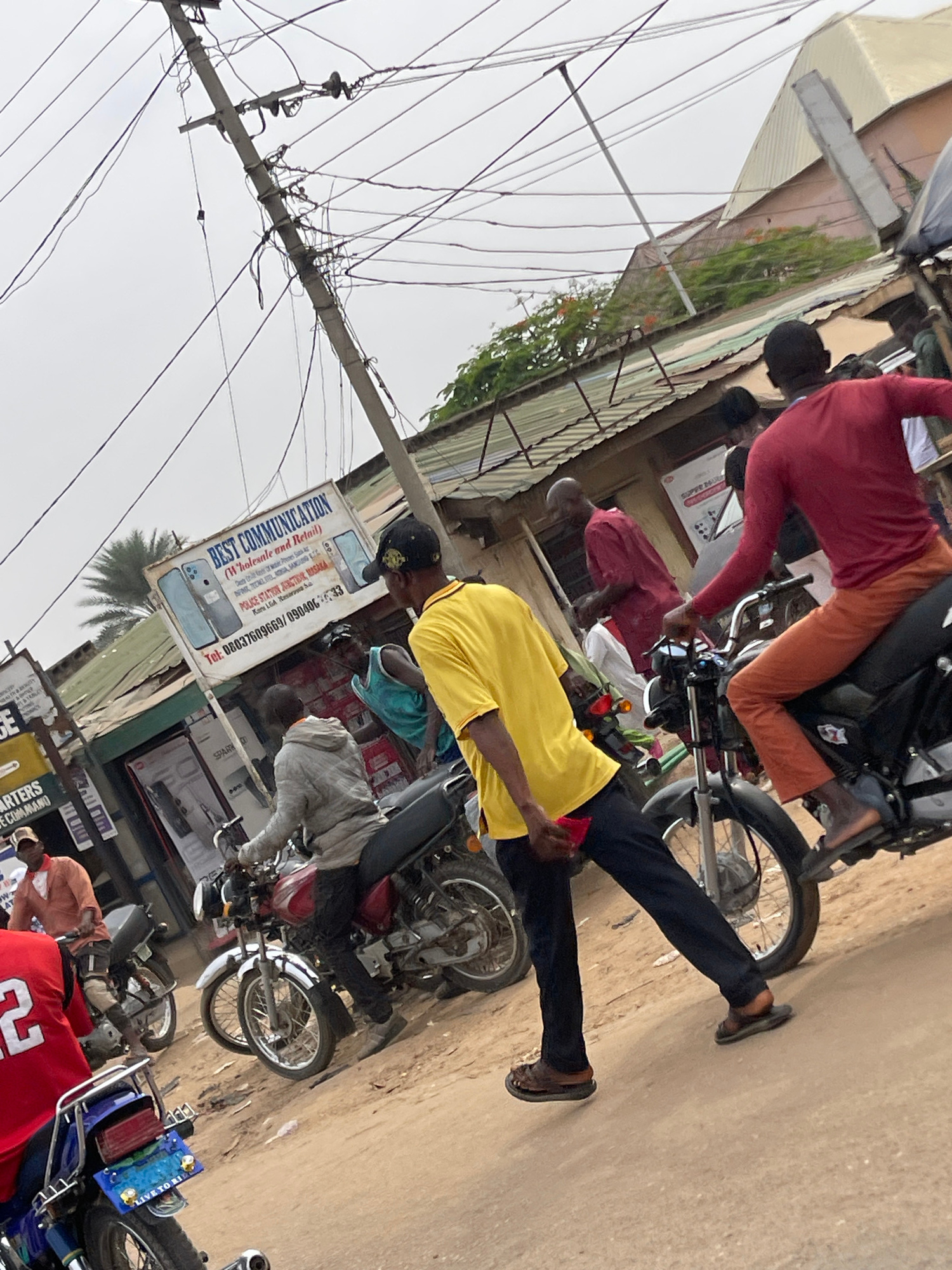 Here's a detailed description of the image: **Location:** Masaka, Nigeria (identified through signage in the image). **Overview:** The image captures a street scene in Masaka, Nigeria. The scene is…read more