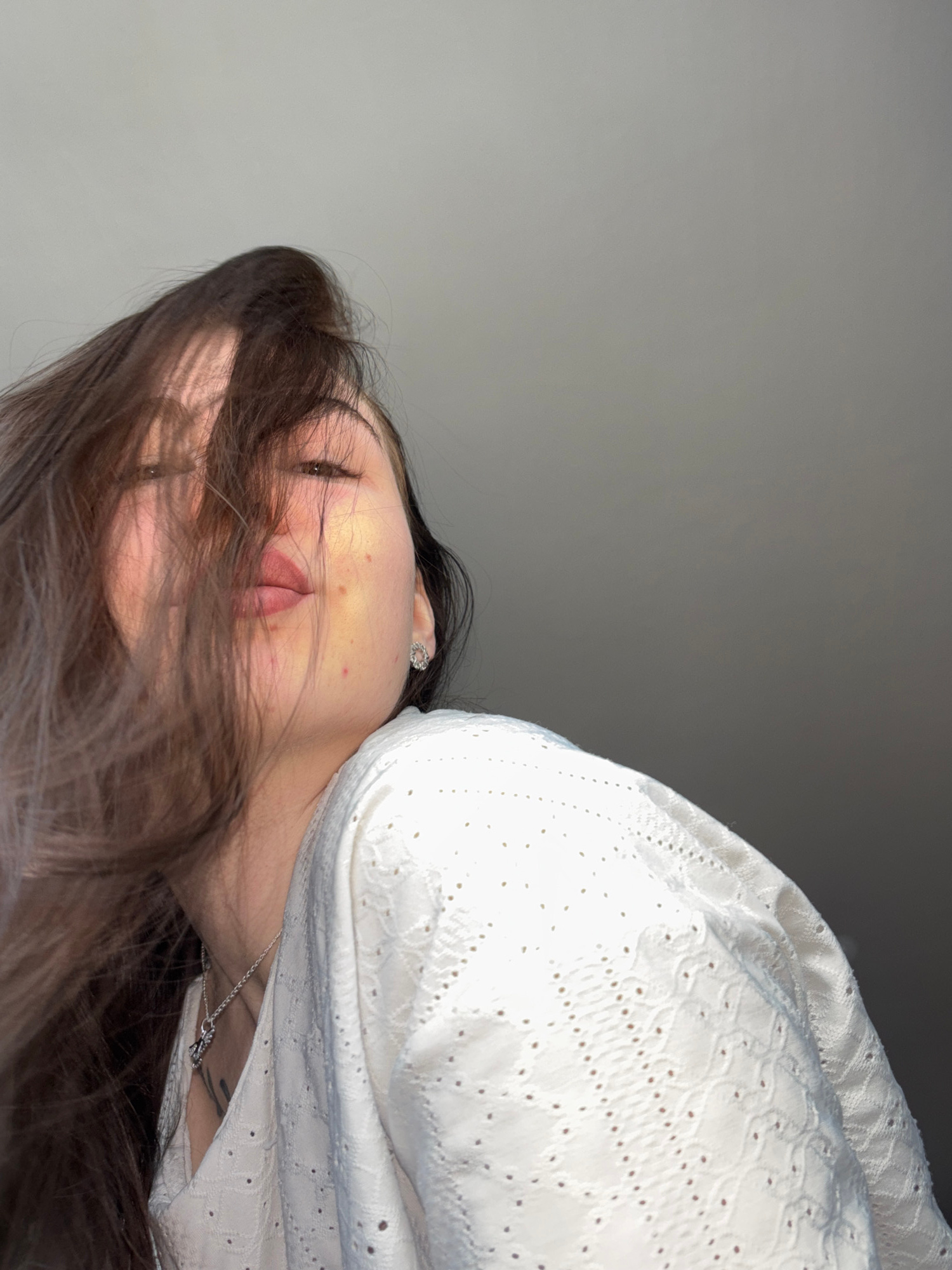 A woman with long, brown hair is lying down. Her face is partially obscured by her hair. She is wearing a white, eyelet-style top and a silver necklace. She has fair skin and a small earring. The back…read more