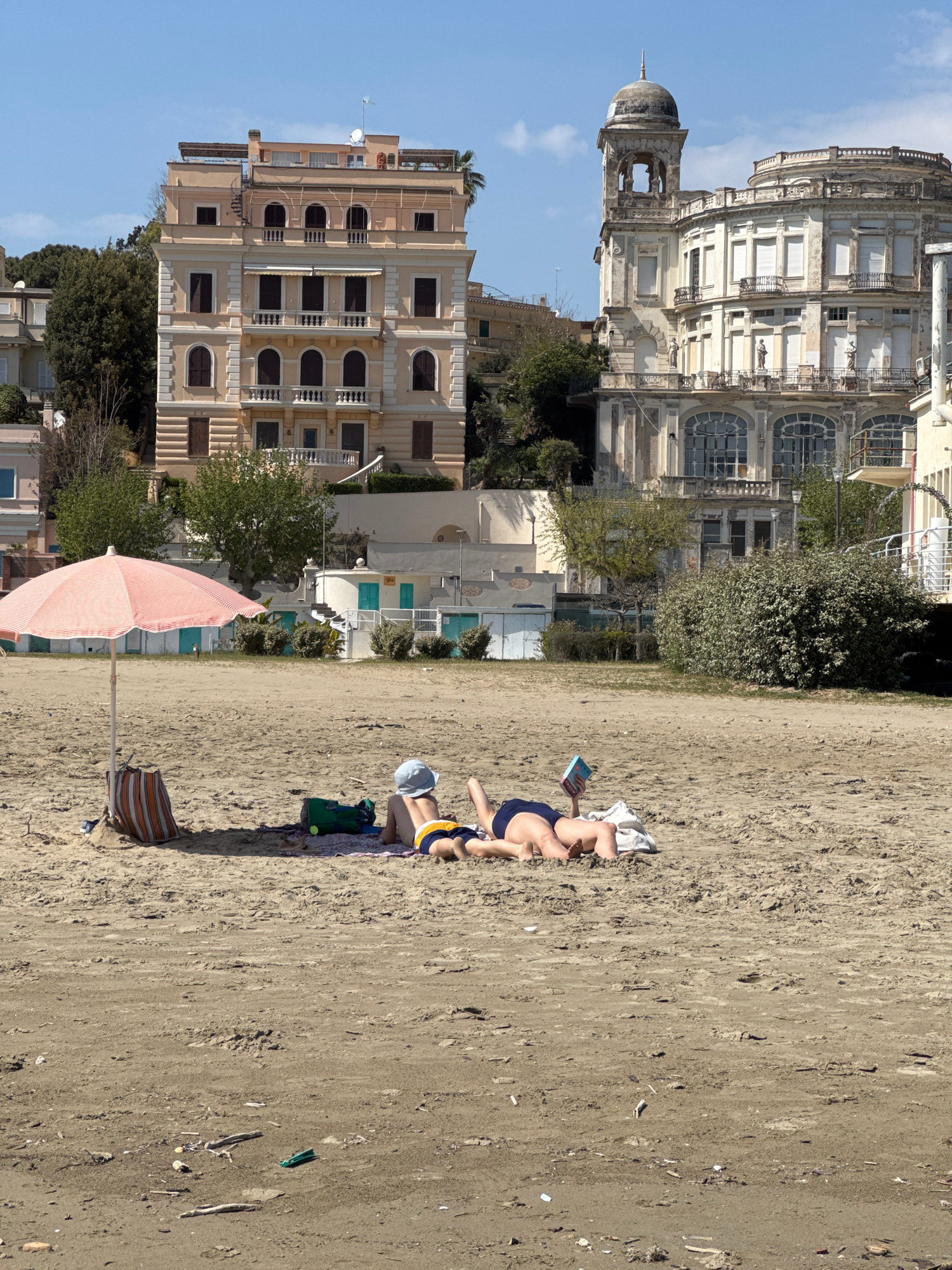 The image depicts a beach scene in Anzio, Italy. A person is lying on the sand, presumably sunbathing and reading a book. Nearby, an umbrella and beach chair are situated. In the background, buildings…read more