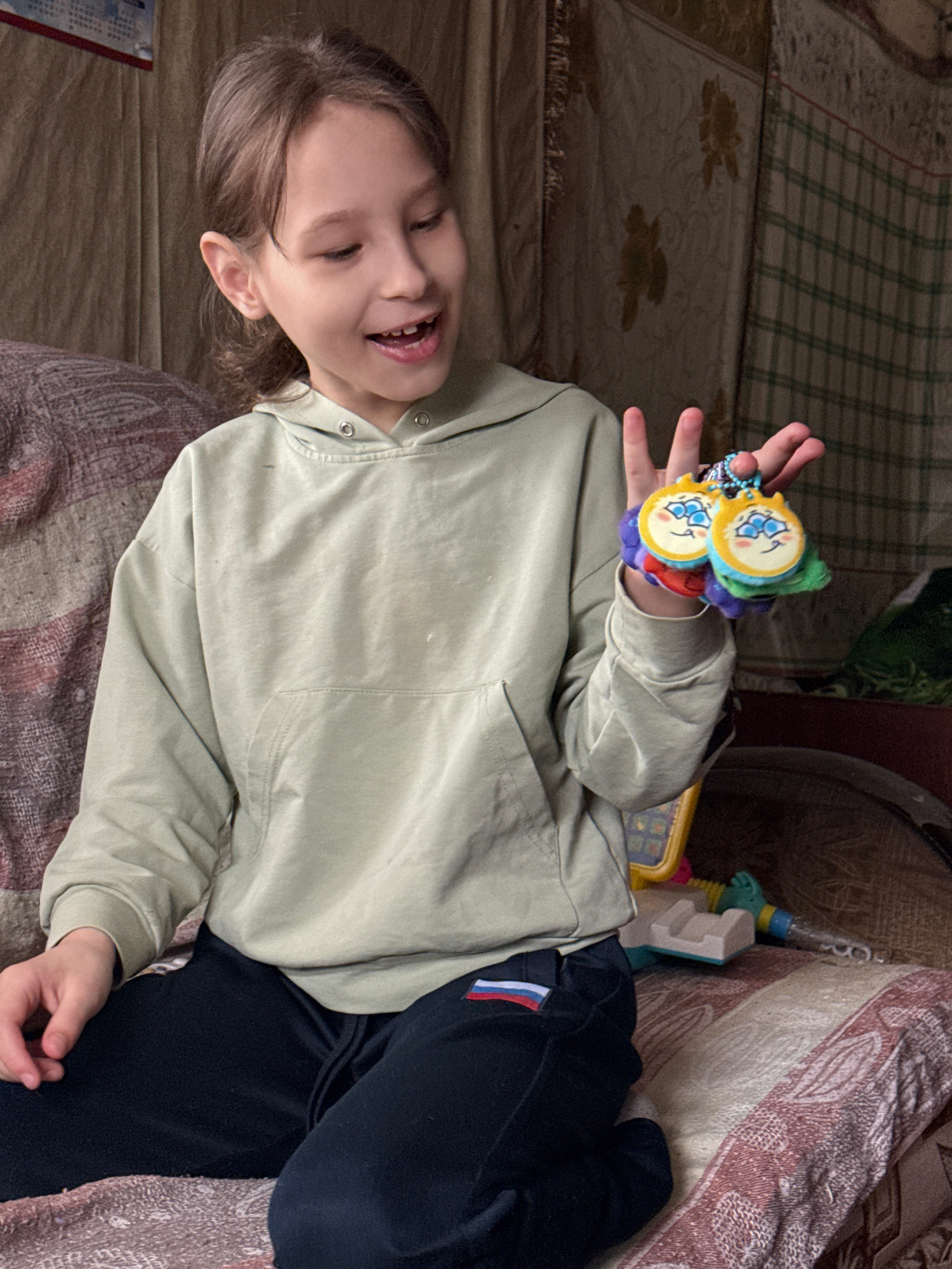 A young child with light brown hair is lying on a bed. The child is wearing a light green hoodie and dark blue pants. The child is holding a colorful toy in their right hand. The child is smiling and…read more
