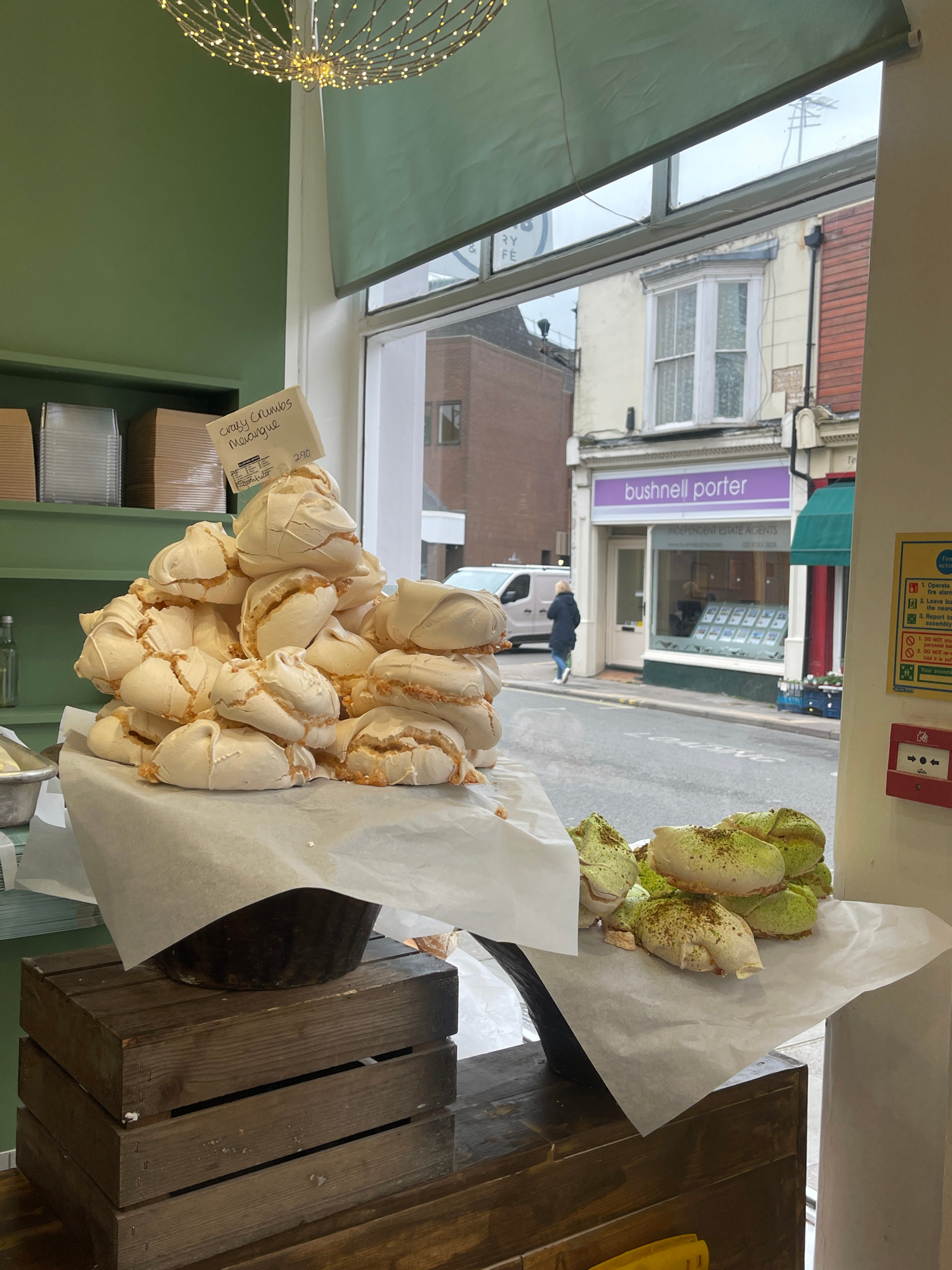 Here's a detailed description of the image: **General Overview:** The image appears to be taken from inside a bakery or shop, looking out towards a street in Portsmouth, United Kingdom. The focus is…read more