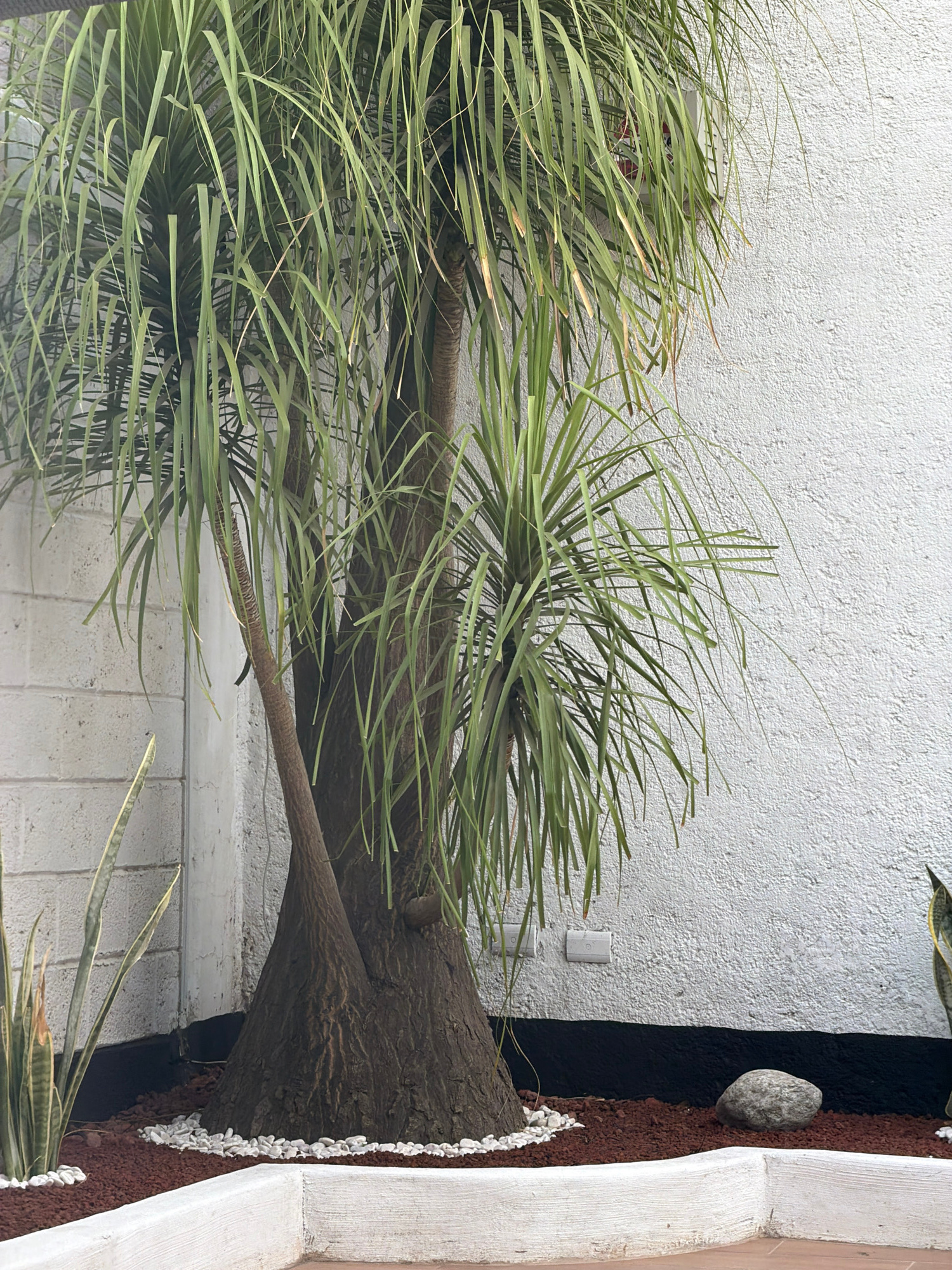 A sideways, medium shot depicts a Dracaena draco tree planted in the garden, which is adjacent to a stucco wall. The tree, with its thick brown trunk, has multiple branches from which clusters of long…read more