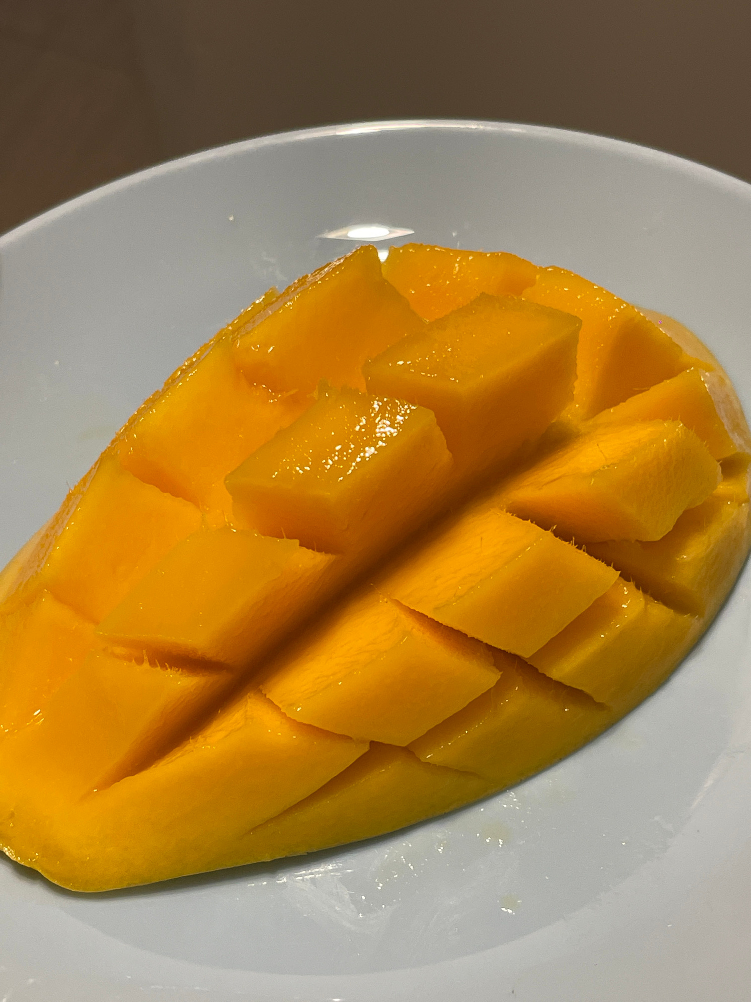 A ripe mango, prepared in a "hedgehog" cut style, rests on a light blue plate. The mango is a vibrant yellow color, and the cuts are visible, creating a pattern of raised cubes. The plate is glossy an…read more