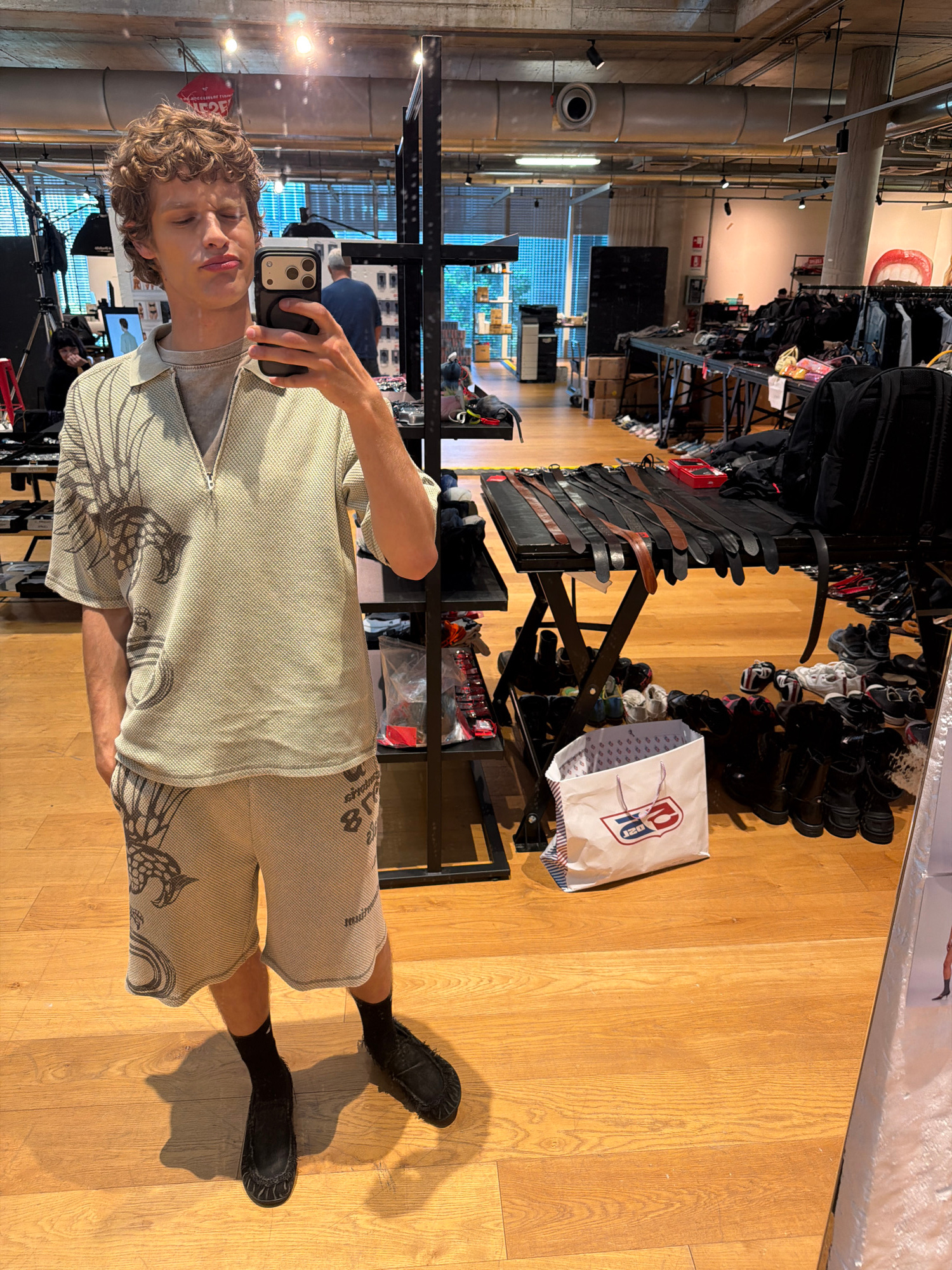 A young man is captured in a mirror selfie within what appears to be a retail store or showroom in Mirabella, Italy. He stands facing the mirror, holding a smartphone to take the picture, with his ref…read more