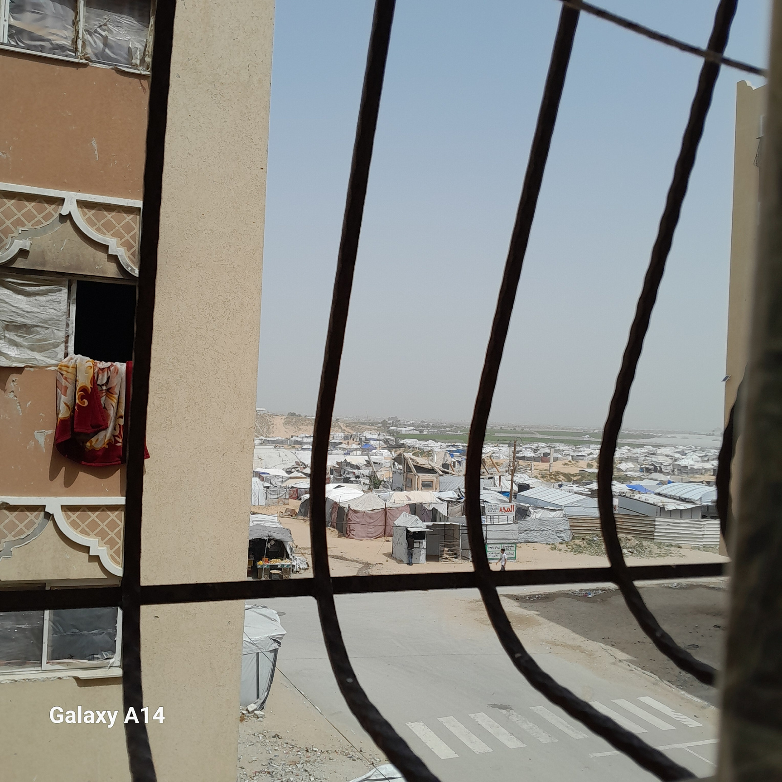 The image captures a wide view from an elevated position, likely a balcony or window, looking out over a densely populated area in Khan Yunis, Palestinian Territory. The scene is framed by dark metal…read more