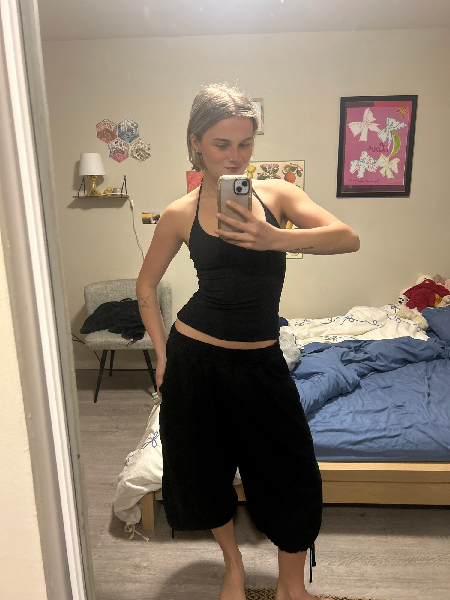 A photograph taken indoors, likely in a personal residence, features a person reflected in a mirror. The individual, a young adult with light-colored hair, is dressed in a black tank top and black pan…read more