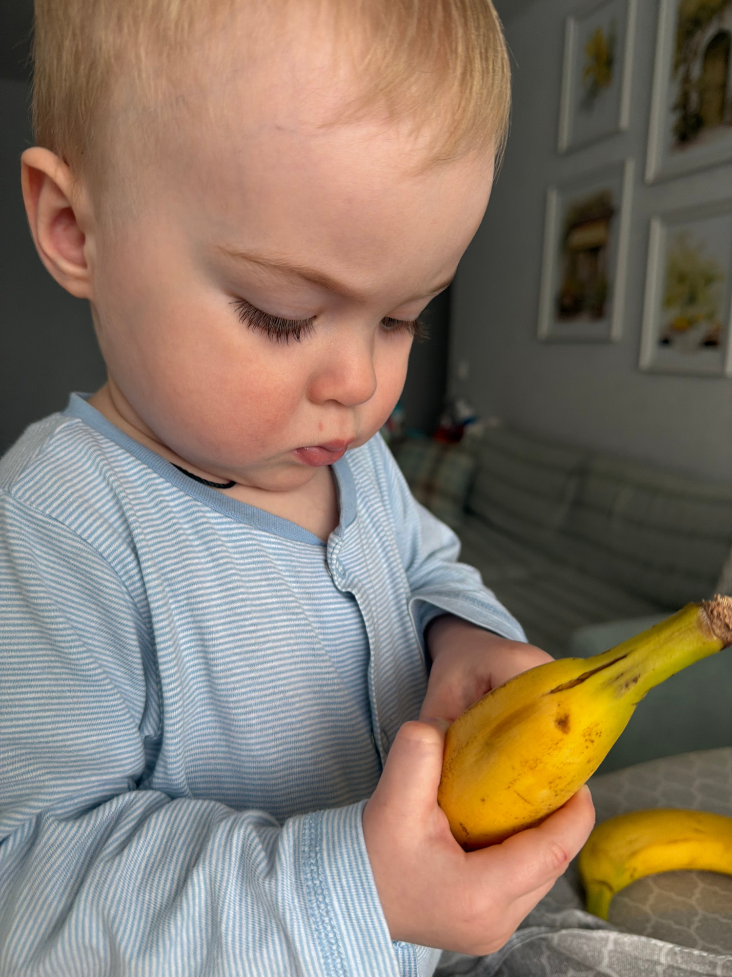 A close-up, slightly high-angle shot shows a baby holding a banana. The baby has fair skin, blonde hair, and closed eyes with long eyelashes. The baby is wearing a light blue and white striped shirt.…read more