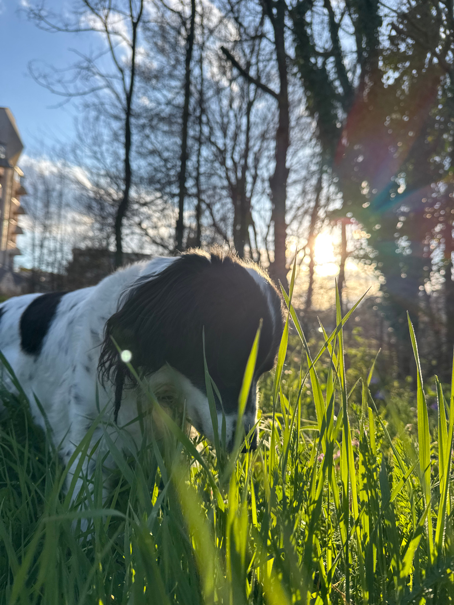 The image captures a low-angle view of a black and white dog, possibly a Springer Spaniel, with its head partially obscured by tall green grass. The dog is positioned on the right side of the frame, i…read more