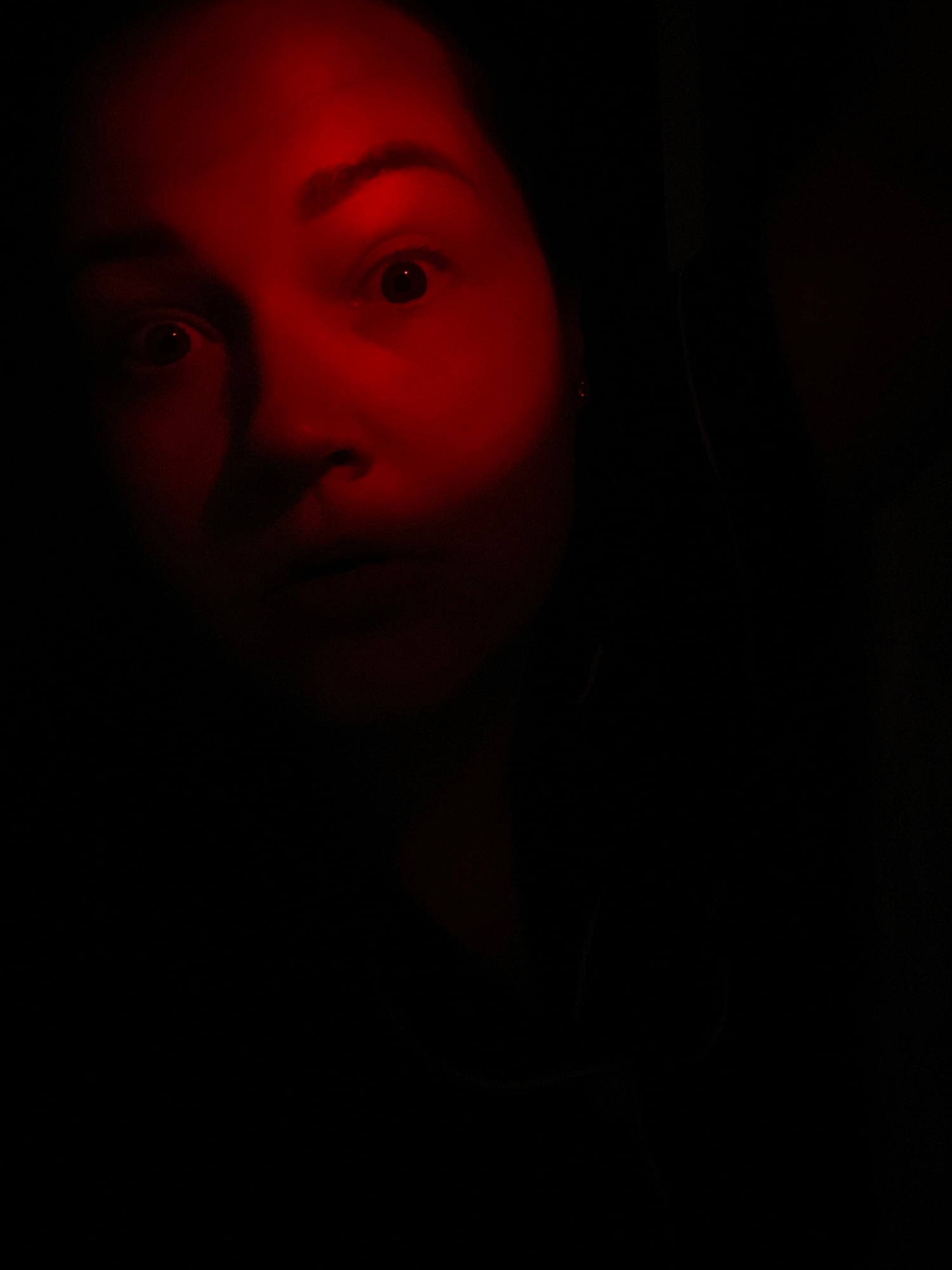 The image presents a close-up of a person's face, dramatically illuminated by an intense red light against a completely dark background. The face is positioned on the left side of the frame, tilted, w…read more