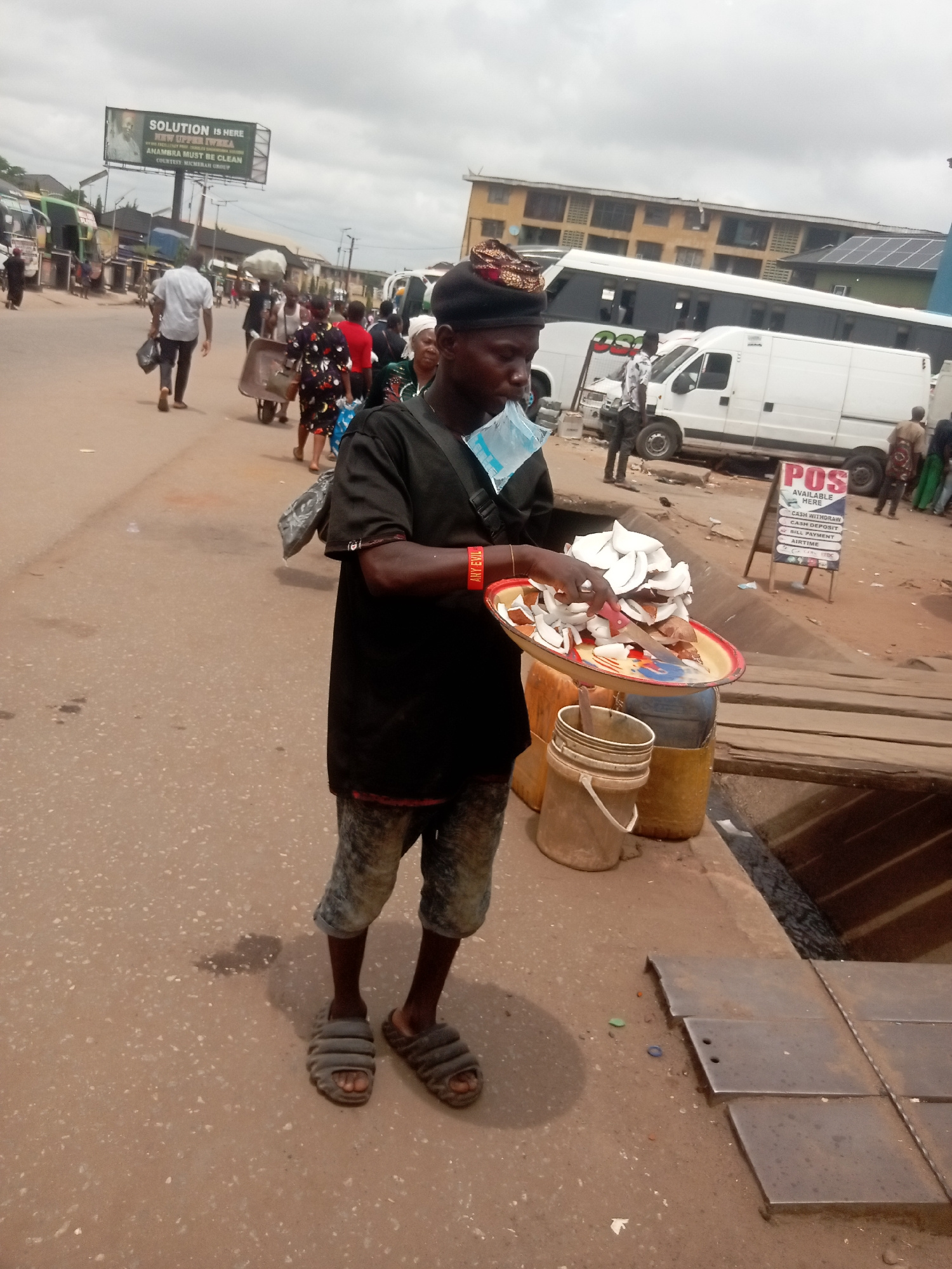 A medium shot depicts a man standing on the street in Onitsha, Nigeria, likely engaged in vending sliced coconut. The man, attired in a black t-shirt, patterned cap, and cutoff denim shorts, holds a t…read more