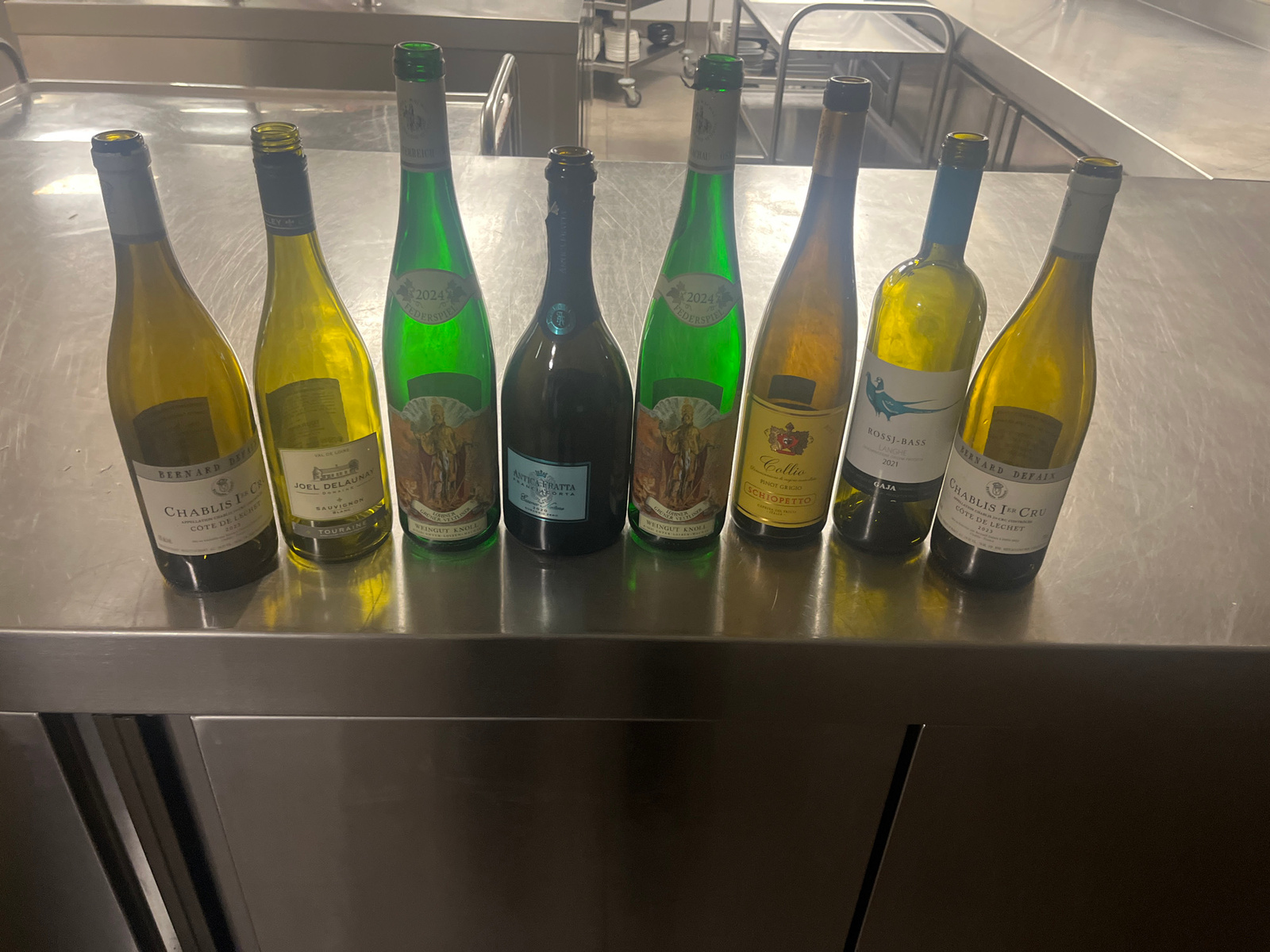 Eight bottles of predominantly white wine, including one sparkling wine, are displayed in a line on a highly reflective stainless steel countertop. The setting appears to be a professional kitchen or…read more