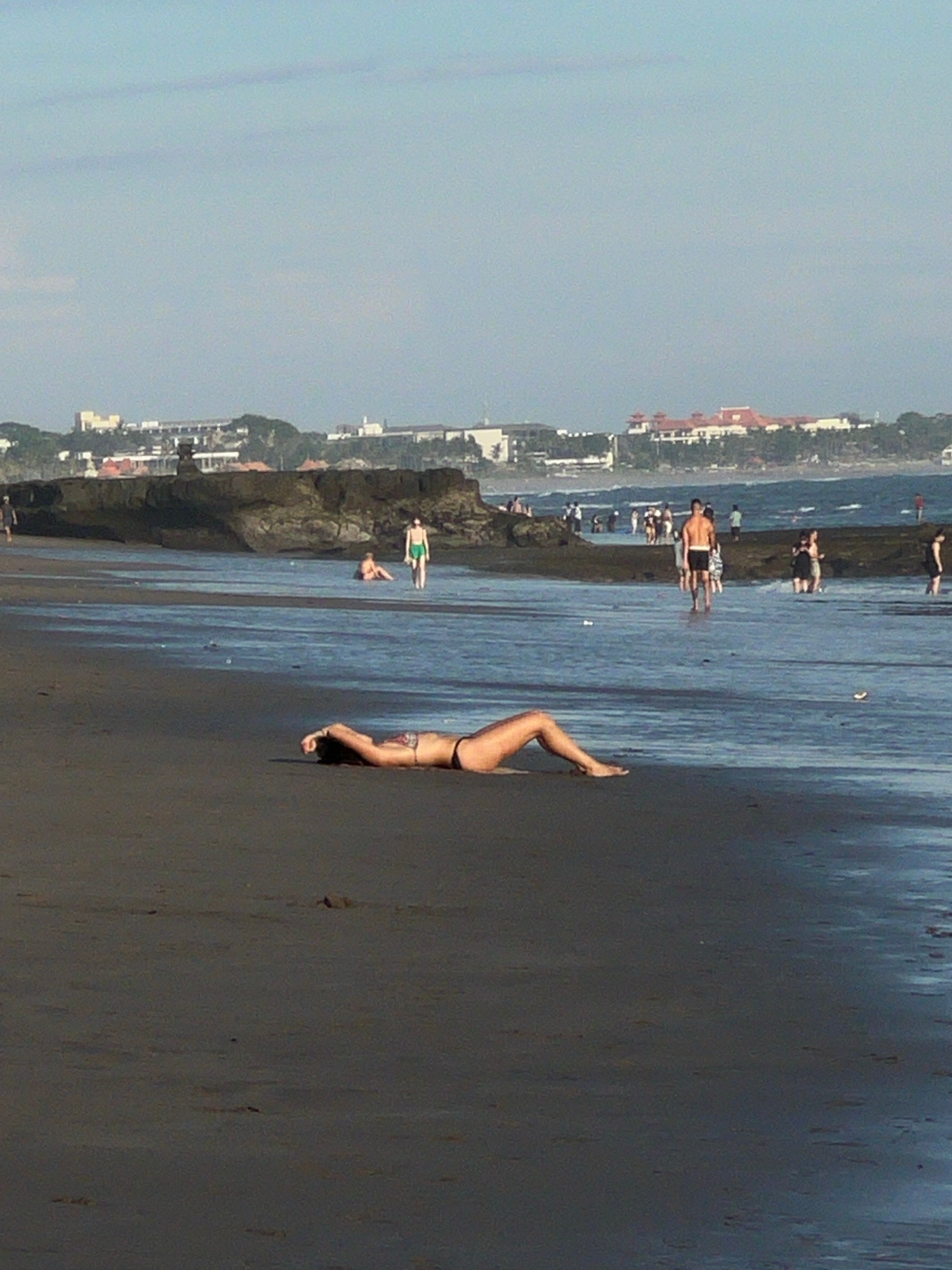 A woman in a bikini is doing a handstand on a beach. The beach is wet and dark, suggesting it's low tide. Other people are visible in the background, some standing near a rocky outcrop and others further down the beach. Buildings line the coastline in the background, characteristic of a populated area. The location is North Kuta, Indonesia. | Open Wire