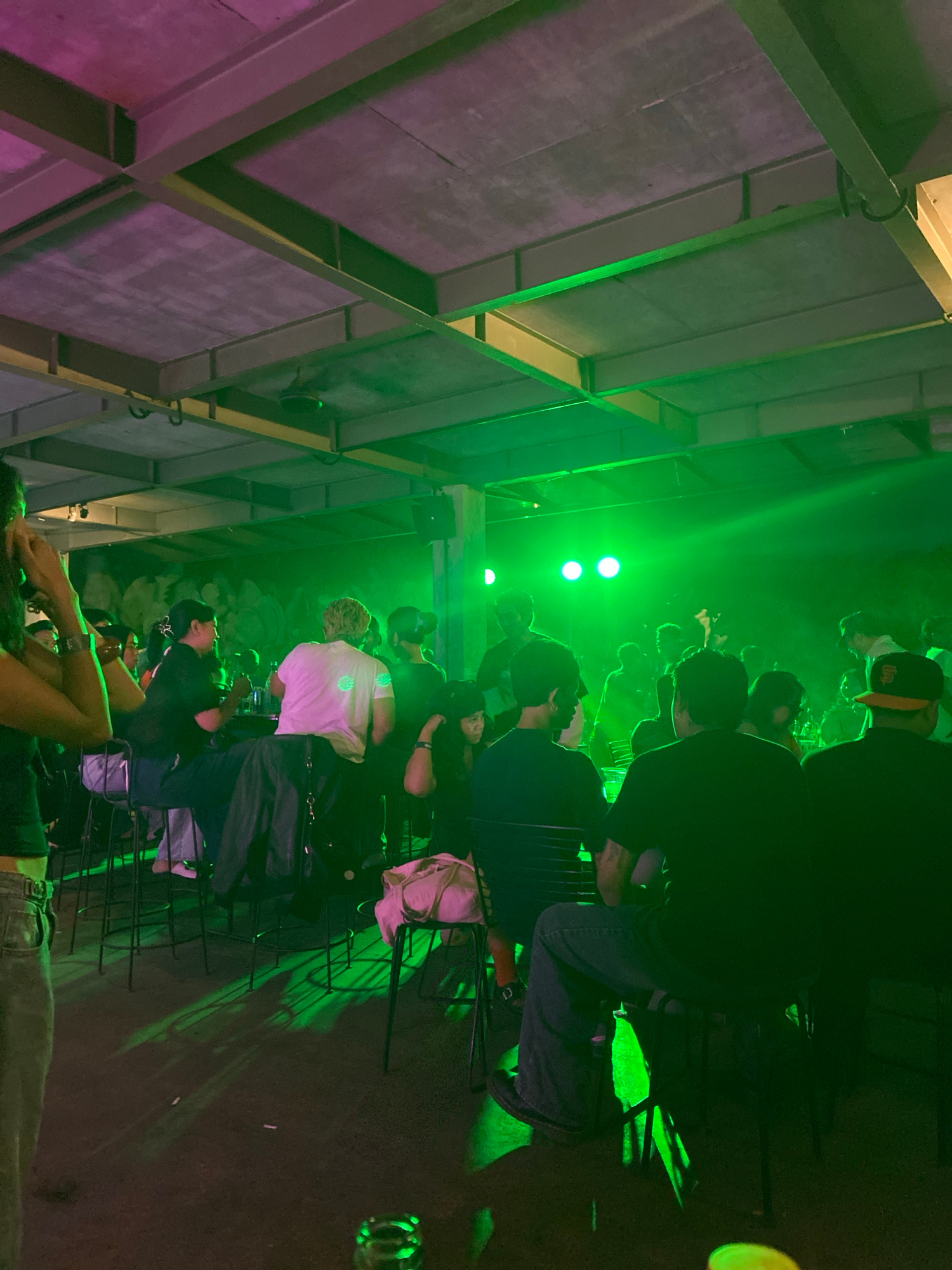 A crowd of people sits at tables in an indoor space with a geometric ceiling structure, illuminated by vibrant green and purple lights. Some individuals wear hats and light-colored shirts. The environ…read more