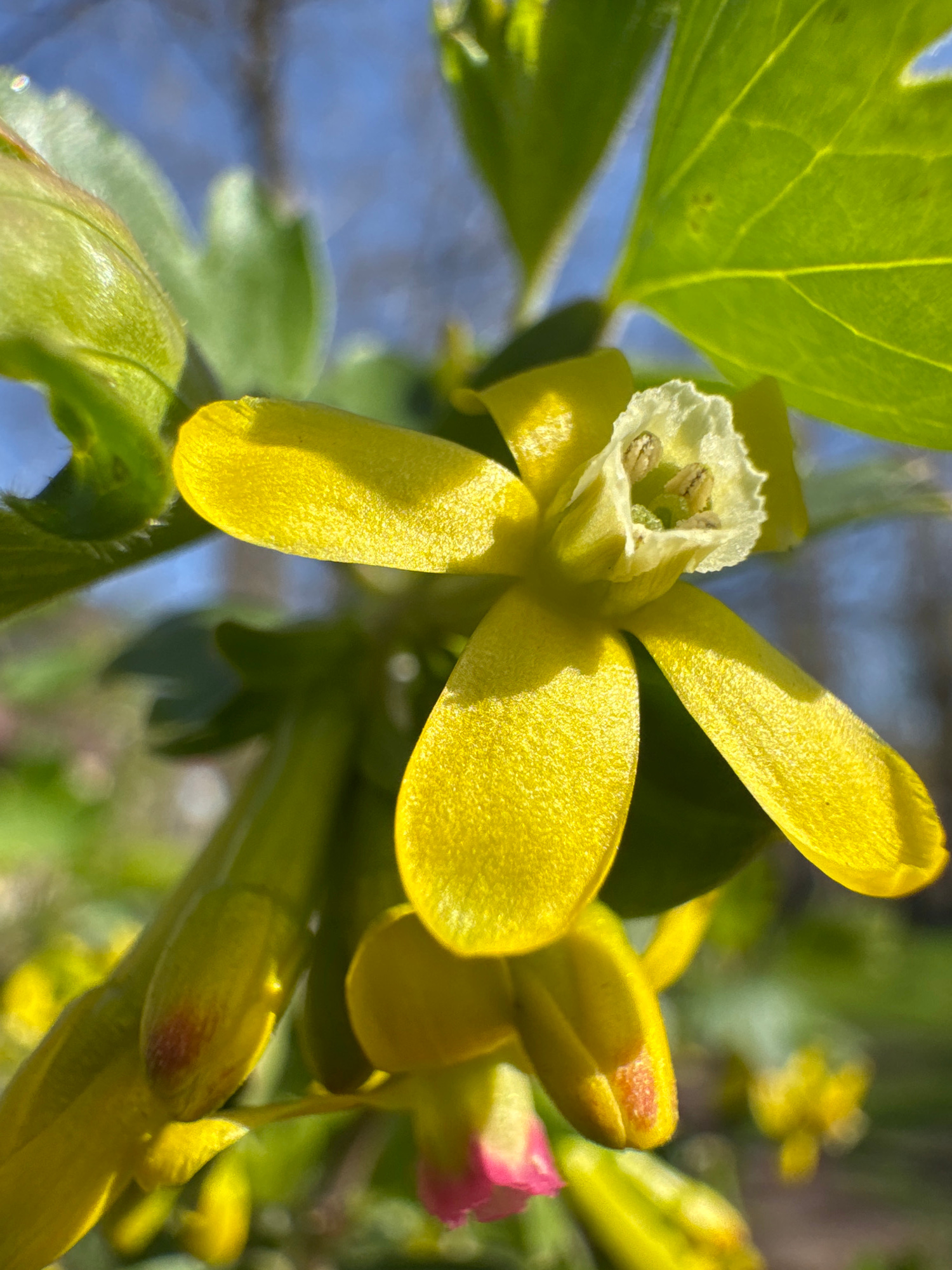 A close-up photograph shows a cluster of golden currant (Ribes aureum) flowers in bloom. The flowers are a bright yellow color with some pinkish-red buds visible, accompanied by green leaves. The back…read more