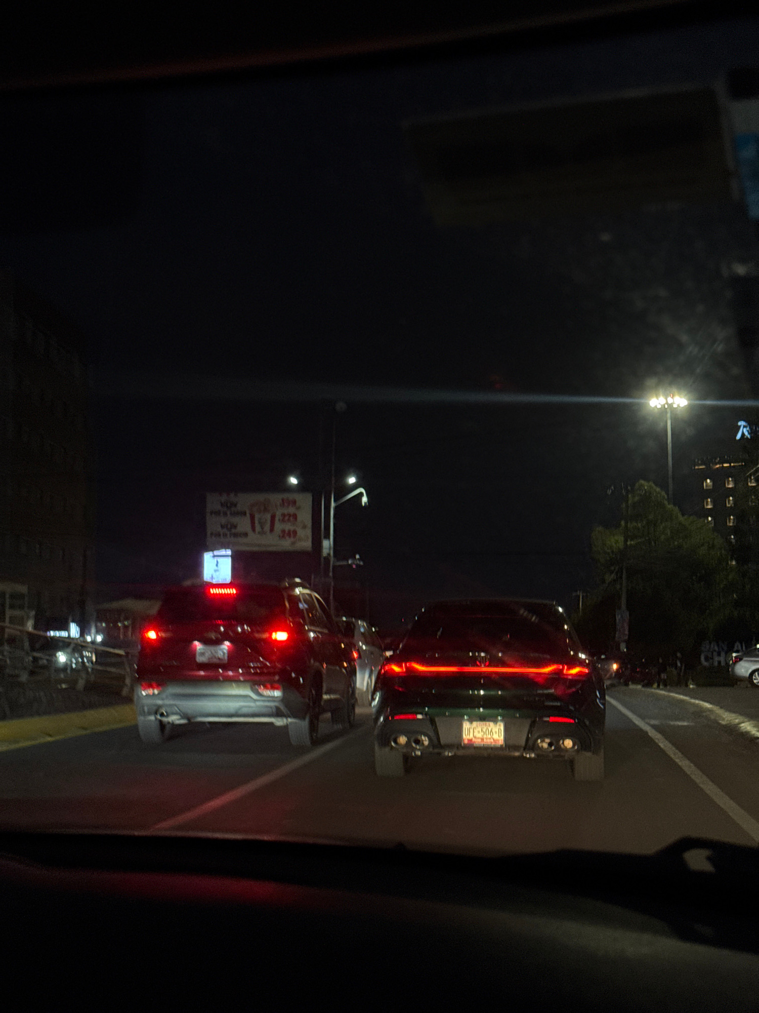 The image depicts a night scene in San Bernardino Tlaxcalancingo, Mexico. Two cars are visible, one directly behind the other. The leading car is black, with illuminated red tail lights and a license…read more