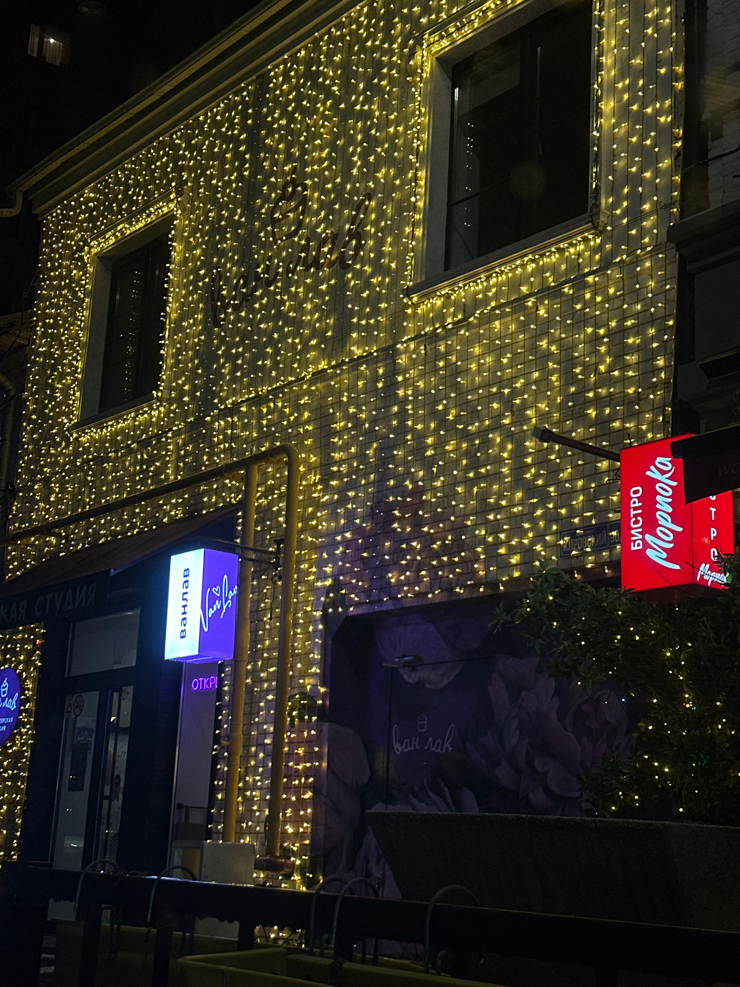 Captured at night in Rostov-on-Don, Russia, the image presents an exterior shot of a building adorned with numerous small, warm-toned lights. The lights form a grid-like pattern across the building's…read more