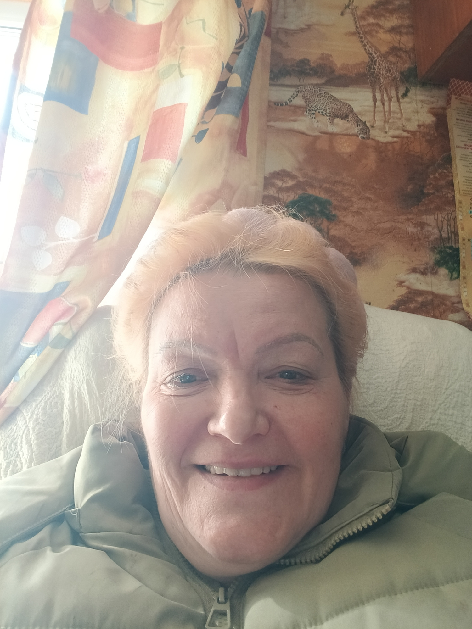 A smiling middle-aged woman with light blonde hair is captured in a close-up selfie, looking directly at the camera. She appears happy and relaxed. She is wearing a puffy, olive-green zippered jacket.…read more