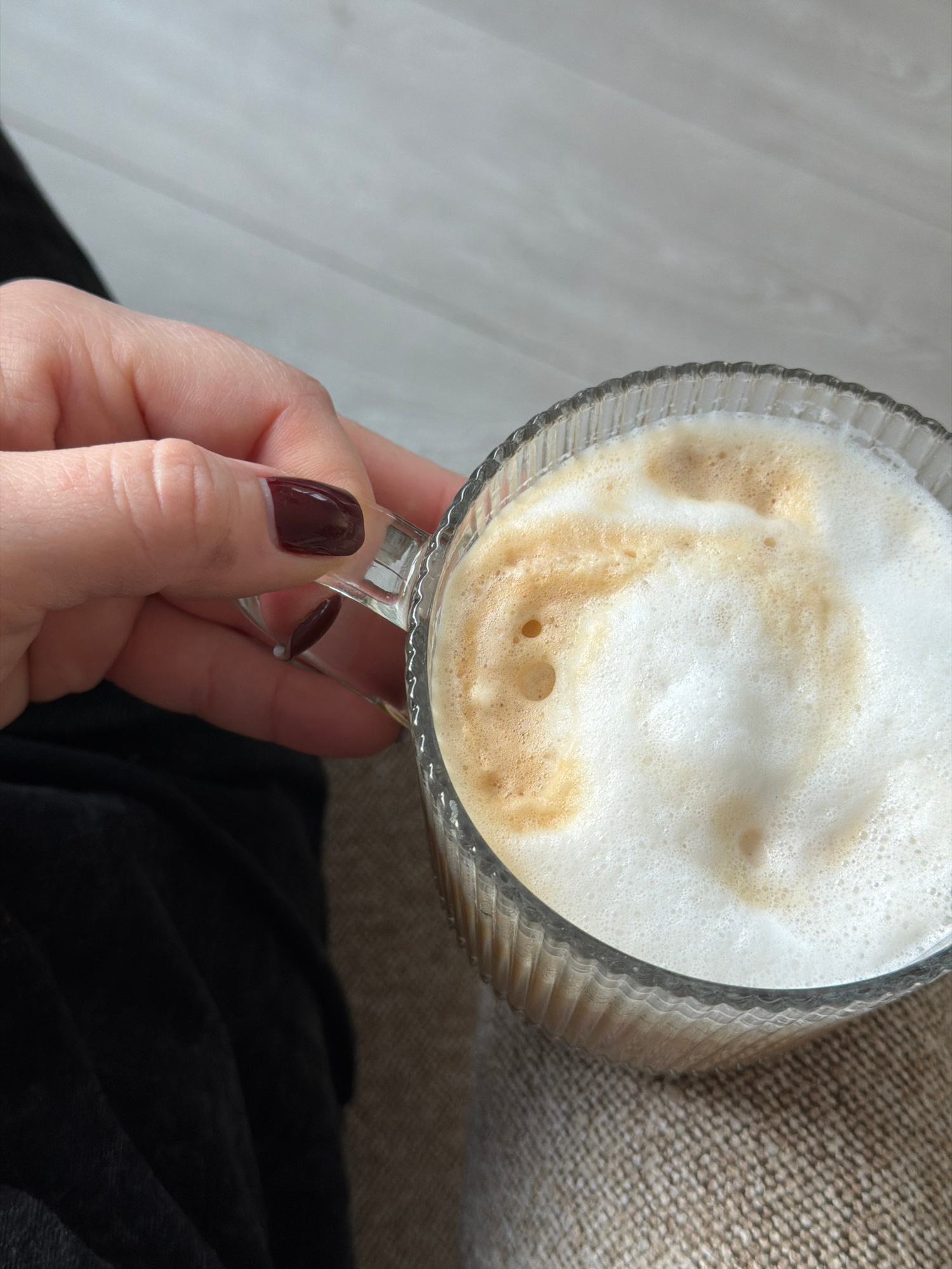A hand with dark brown nail polish holds a clear glass mug filled with a foamy beverage, possibly a latte or cappuccino. The background consists of two textures: a white, slightly textured surface on…read more