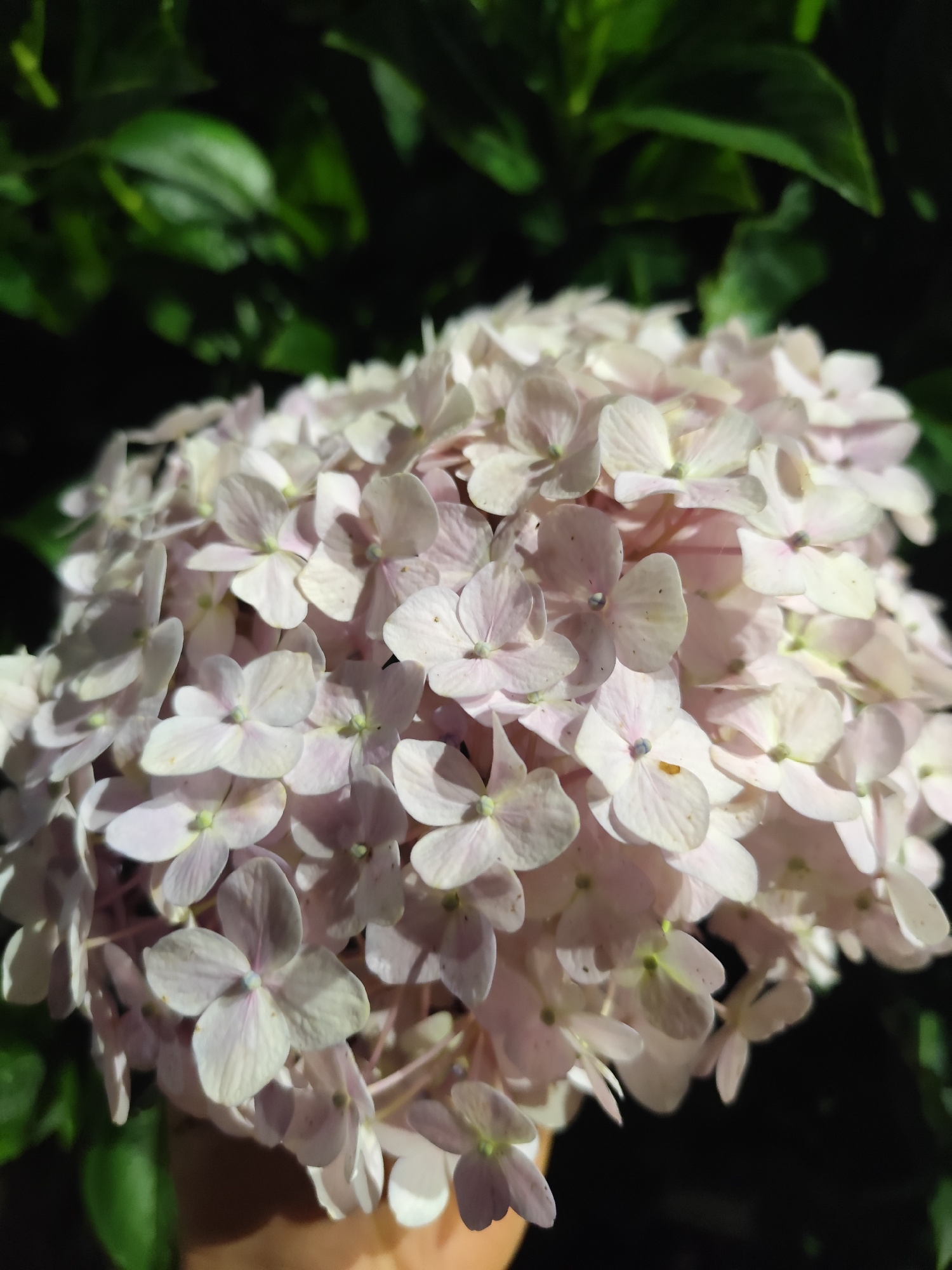 This close-up shot captures a large, spherical cluster of delicate light pink and white hydrangea flowers. Each individual flower features four small, tender petals, with subtle variations in color fr…read more