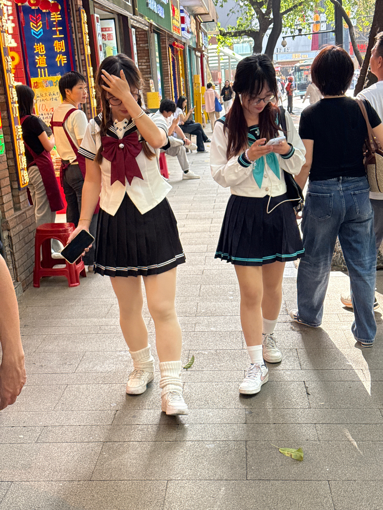 This image captures a vibrant street scene, likely in a commercial area, during bright daylight. The ground is paved with light grey square tiles, and strong sunlight casts distinct shadows. The prim…read more