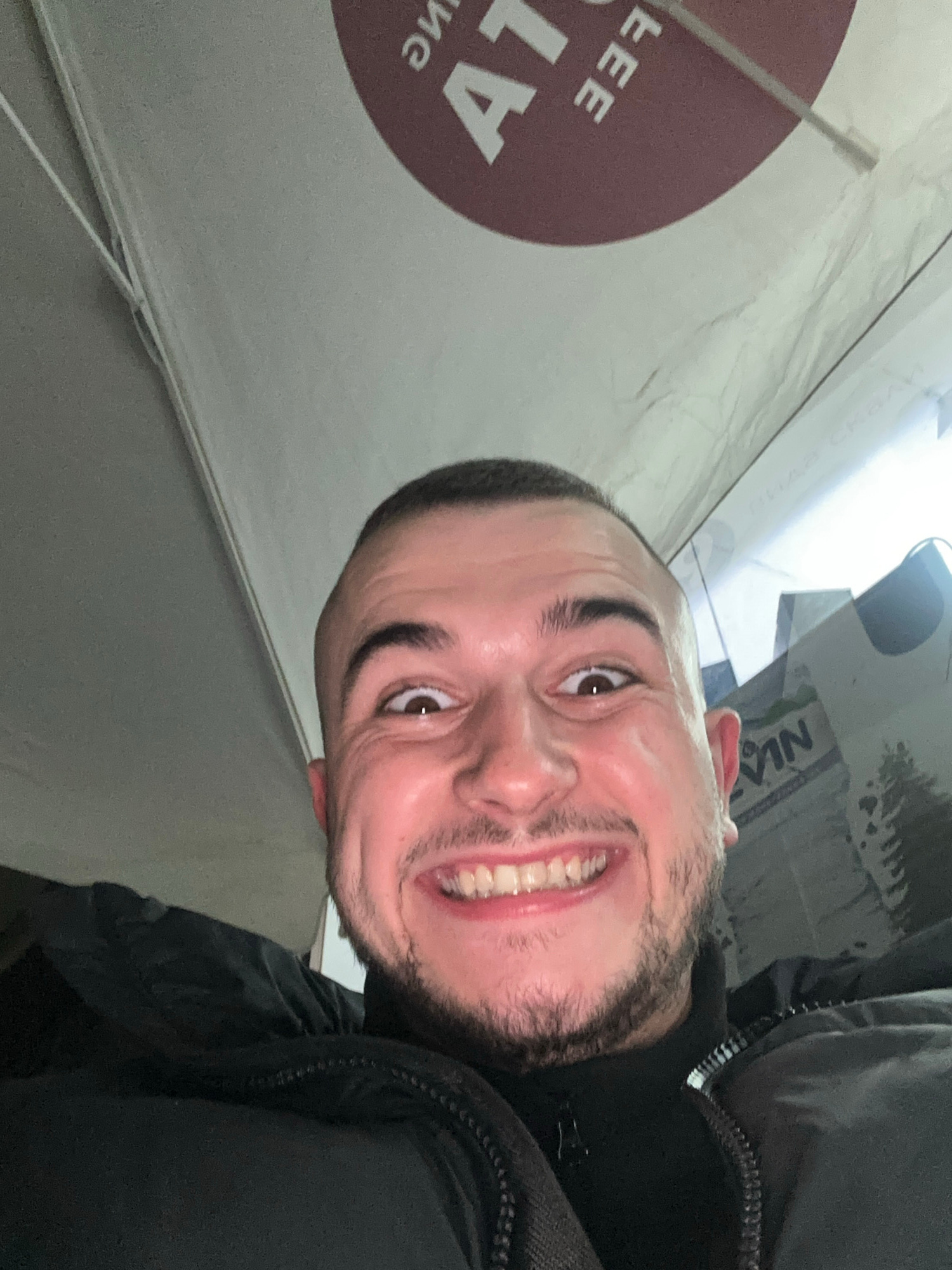 A man is smiling and wearing a black coat. He is indoors in front of what appears to be an advertisement of the word "ATL". The location is Plovdiv, Bulgaria.
