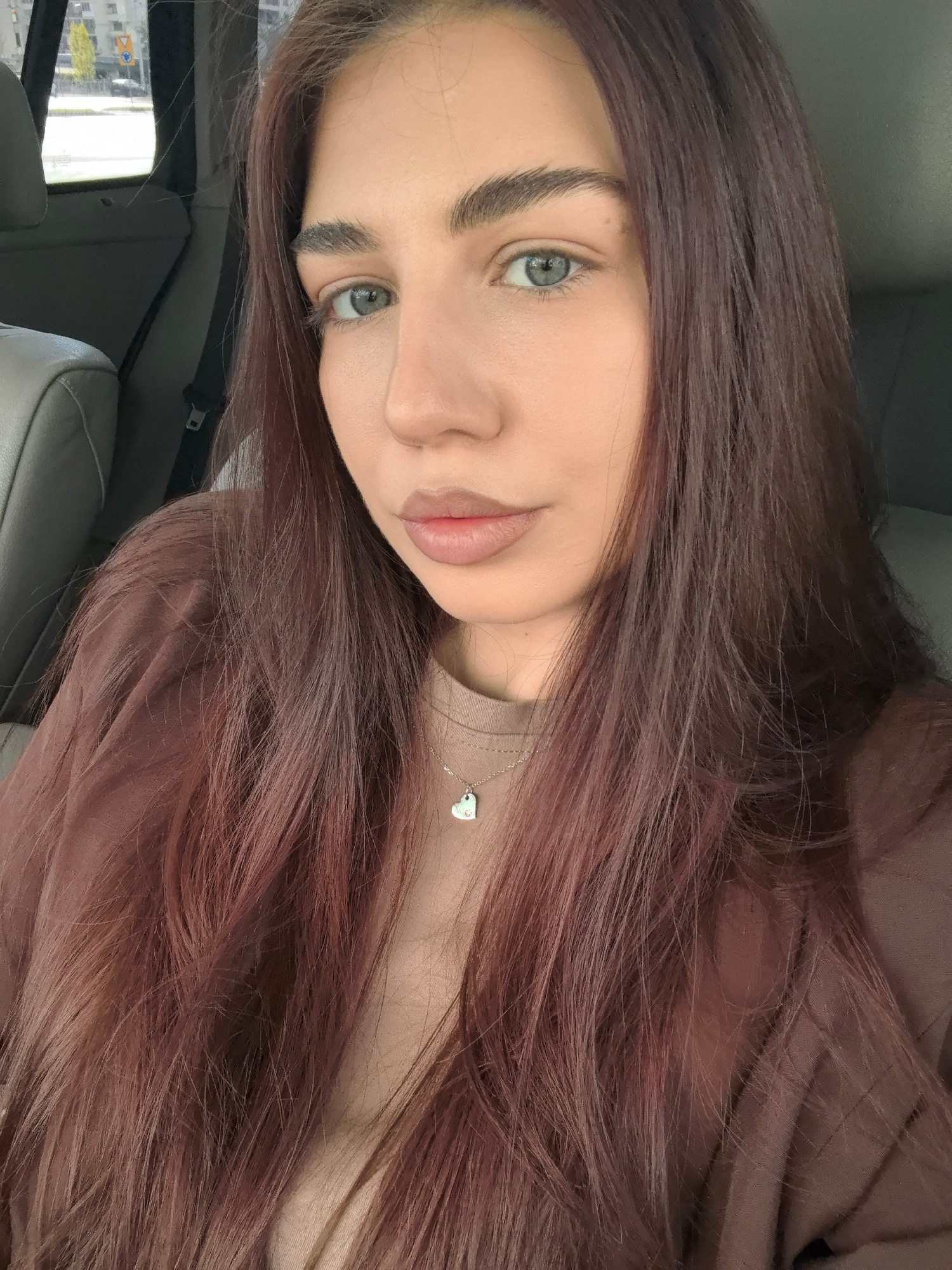 A close-up selfie shows a young woman with long, reddish-brown hair sitting in a car. She has light skin, green eyes, and full lips. She is wearing a tan t-shirt and a brown overshirt. A silver neckla…read more