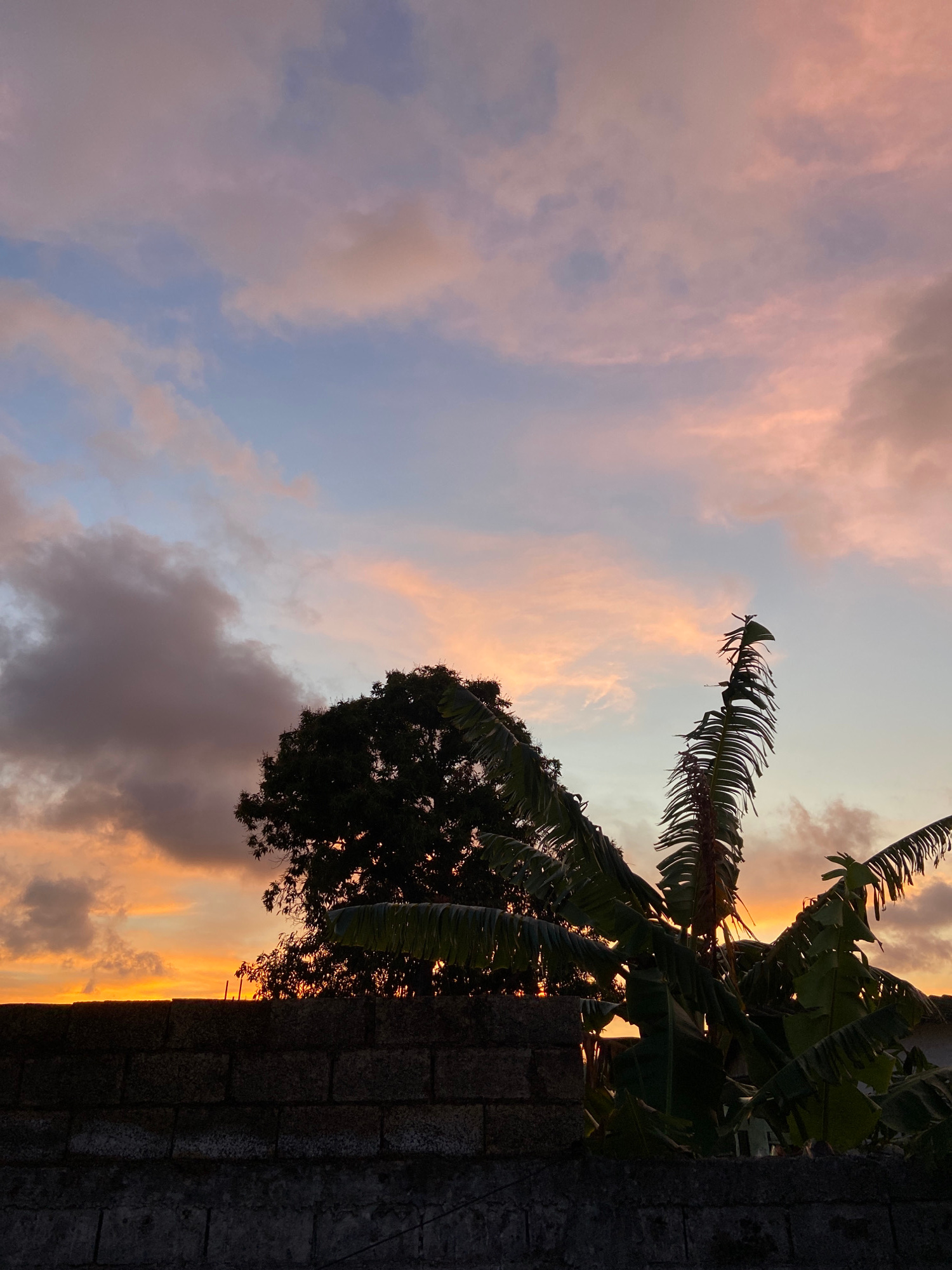 The image captures a scene at dusk or dawn in Juan Griego, Venezuela. A palm tree is partially visible on the right, situated behind a concrete brick wall. The trunk and top of the palm are silhouette…read more