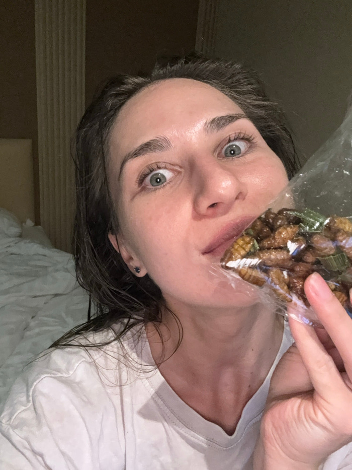An adult female is depicted in a close-up, chest-up indoor shot, likely within a private residence or hotel room in Kamala, Thailand. She has dark hair, light-colored eyes that are wide open, and fair…read more