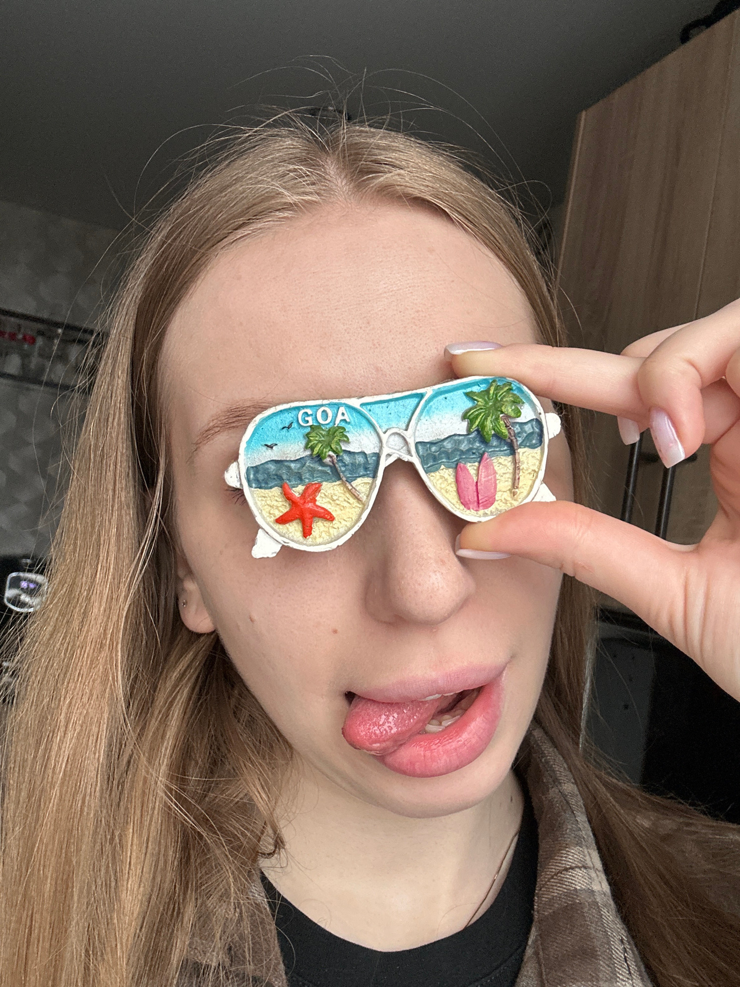 A young woman with blonde hair is lying on her side, sticking her tongue out. A pair of decorative sunglasses with a beach scene design is held over her eyes by a hand with manicured nails. The sungla…read more