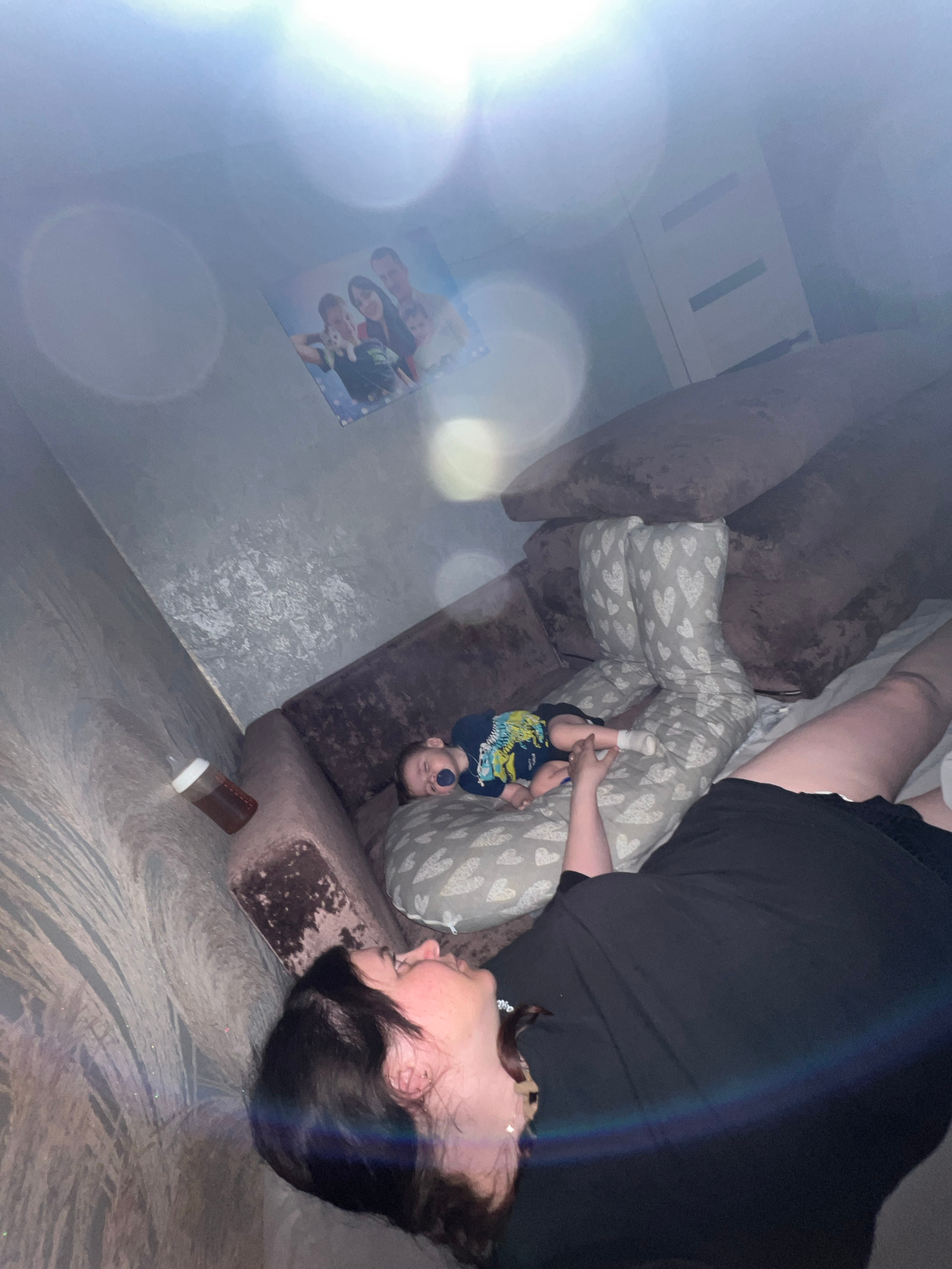 A woman lies on a brown couch with patterned cushions, holding a baby by the legs. The baby, wearing a blue shirt, has a pacifier in its mouth. Next to the couch, on the floor, is a baby bottle and a…read more