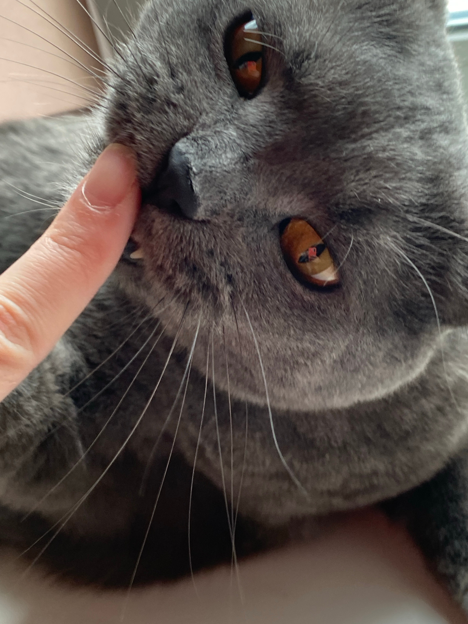 A close-up shot shows a gray British Shorthair cat gently biting a person's finger. The cat has amber eyes and its face fills the frame. The person's finger is positioned near the cat's mouth, and its…read more