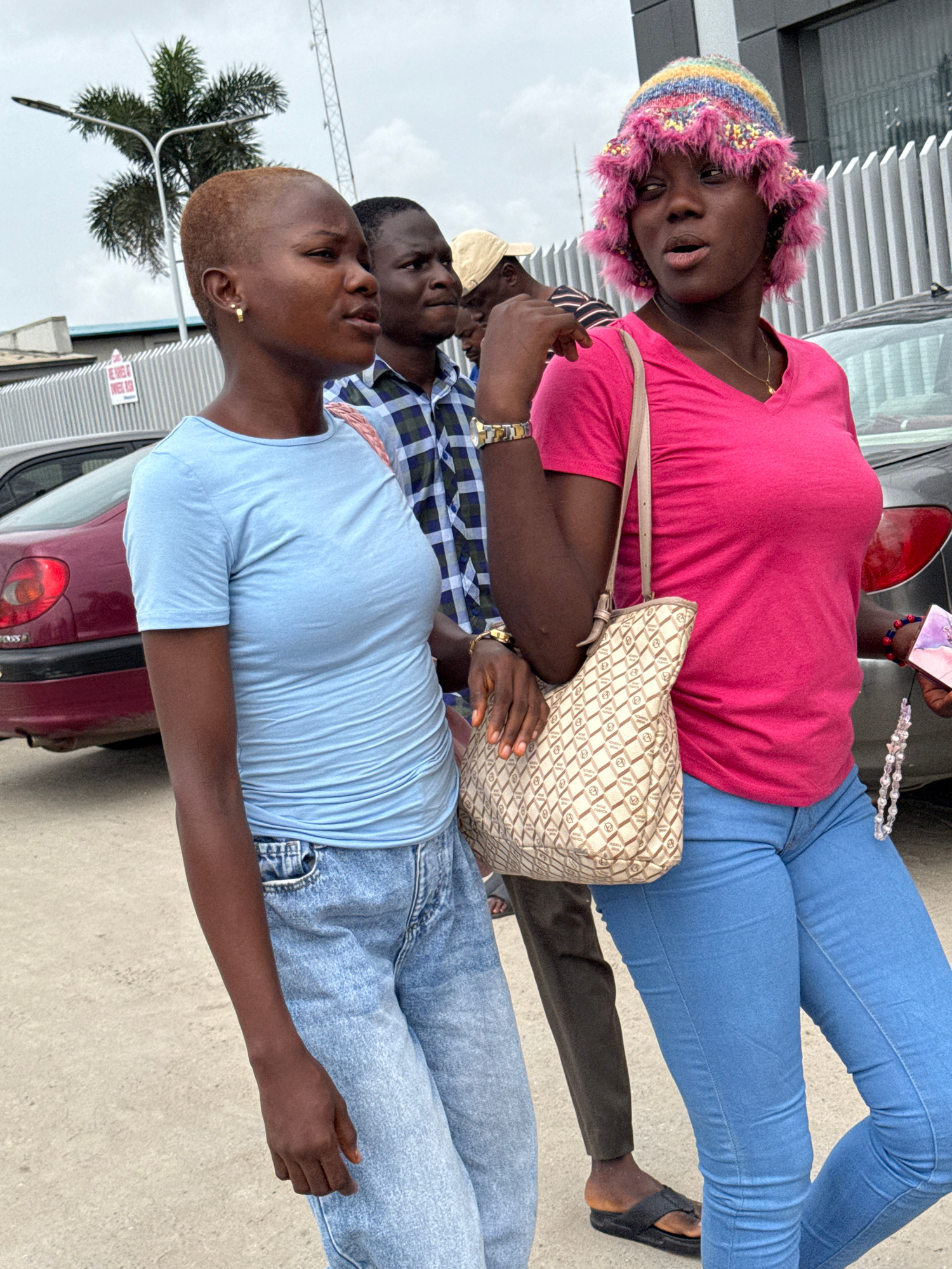 The image shows three dark-skinned individuals, possibly in Lekki, Nigeria, given the presence of a palm tree-like plant and the general aesthetic. The woman at the top wears a pink top, blue jeans, a…read more
