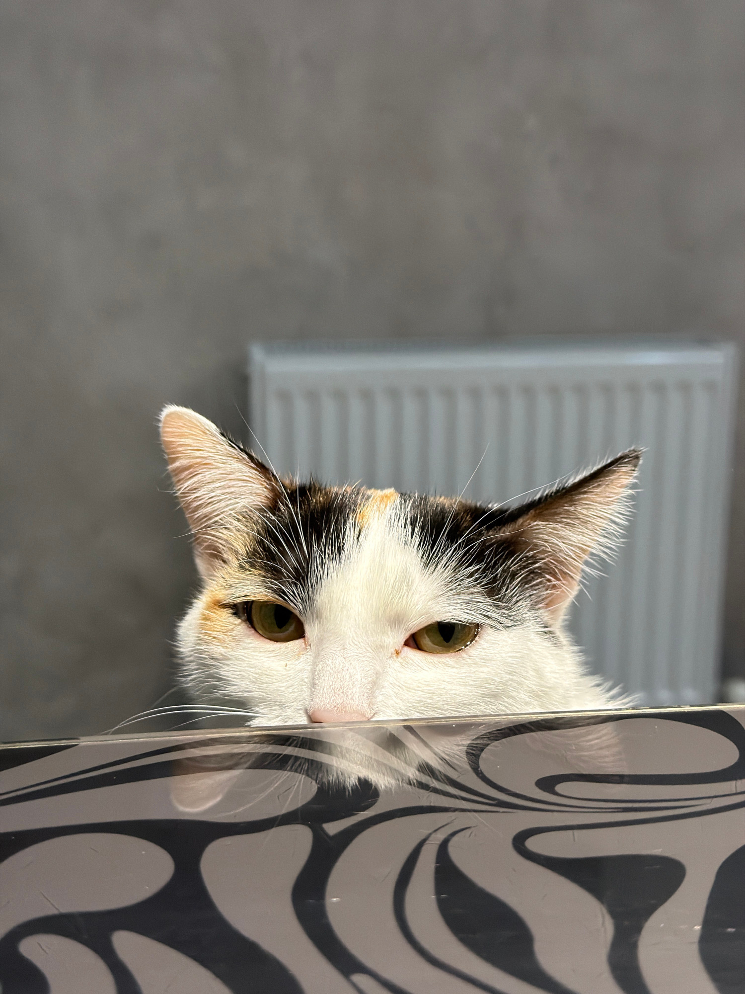 A calico cat peers from behind a black and white patterned object. The cat's face is mostly white with patches of black and orange, and its green eyes are visible. The background appears to be a grey…read more