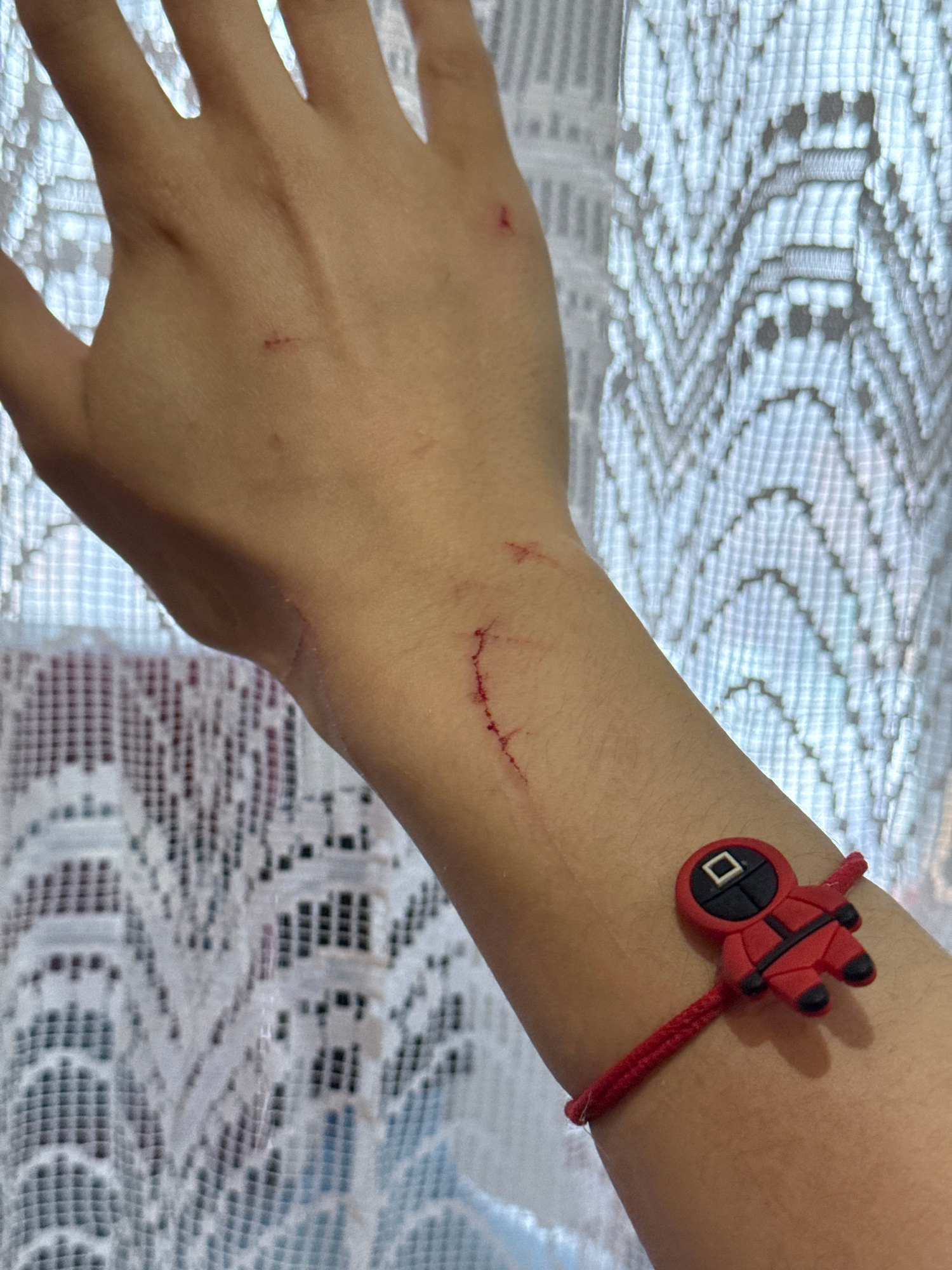 A person's left arm and hand are displayed against a blurred, white lacy background. The arm has several red superficial scratches and marks. A red bracelet with a black and red pendant resembling theβ¦read more
