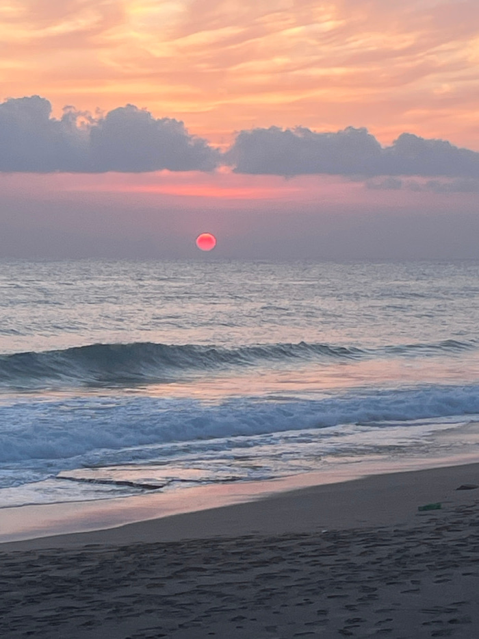 The image displays a sunset over the sea at a beach in Alanya, Turkey. The upper portion of the frame features a sky with horizontal bands of pale orange and pink, transitioning to a softer purple-pin…read more