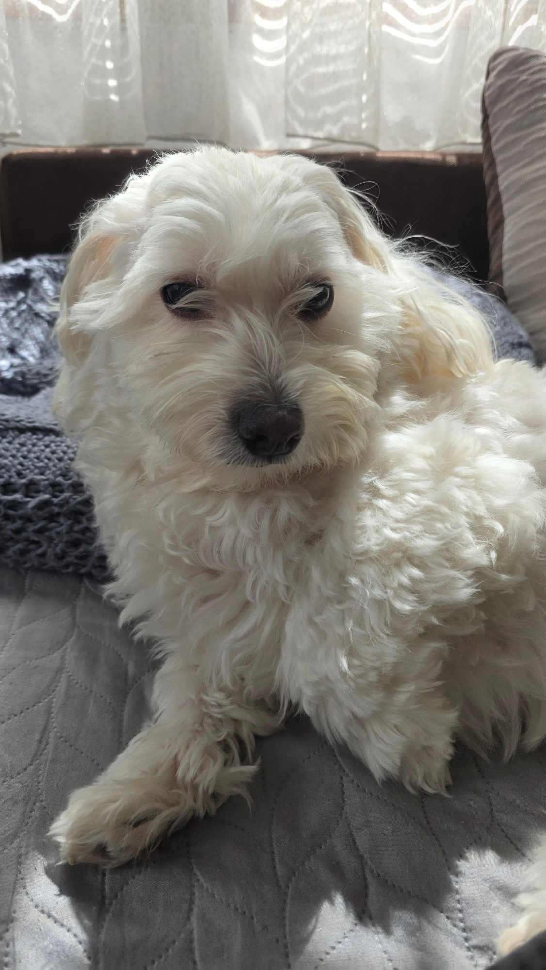 A white Maltese dog is lying on a quilted gray blanket. The dog is facing the camera with its head turned slightly to the left. The dog's paw is visible on the right side of the image. The dog appears…read more