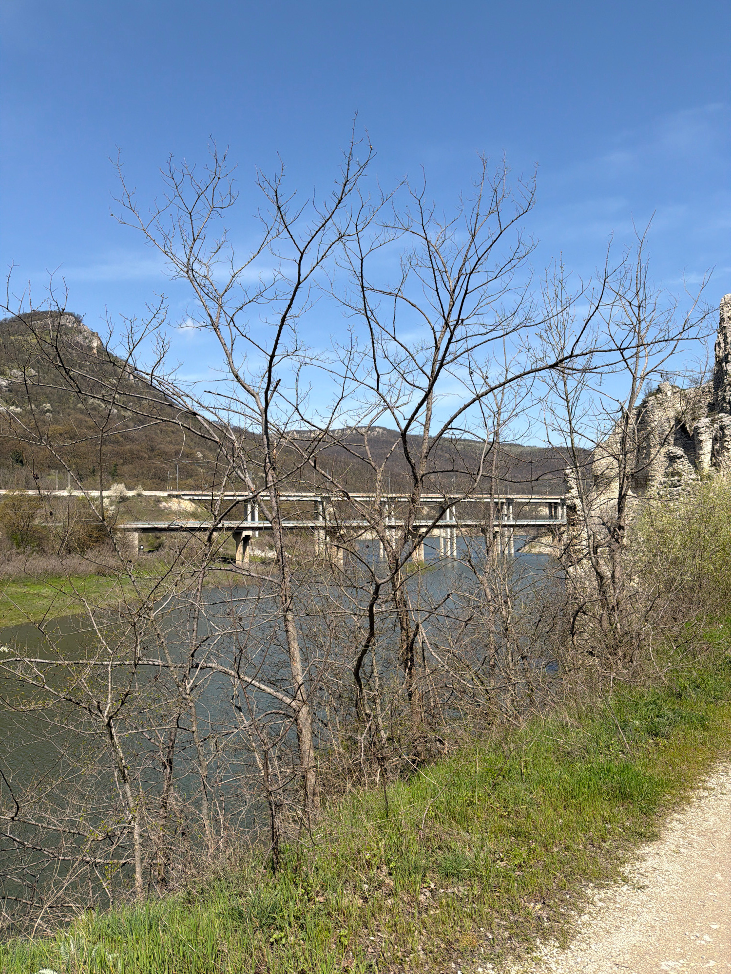 The image depicts a natural scene near Asparuhovo, Bulgaria, potentially along the Iskar River gorge, viewed through leafless trees. In the background is a steel arch bridge spanning the water. The ri…read more