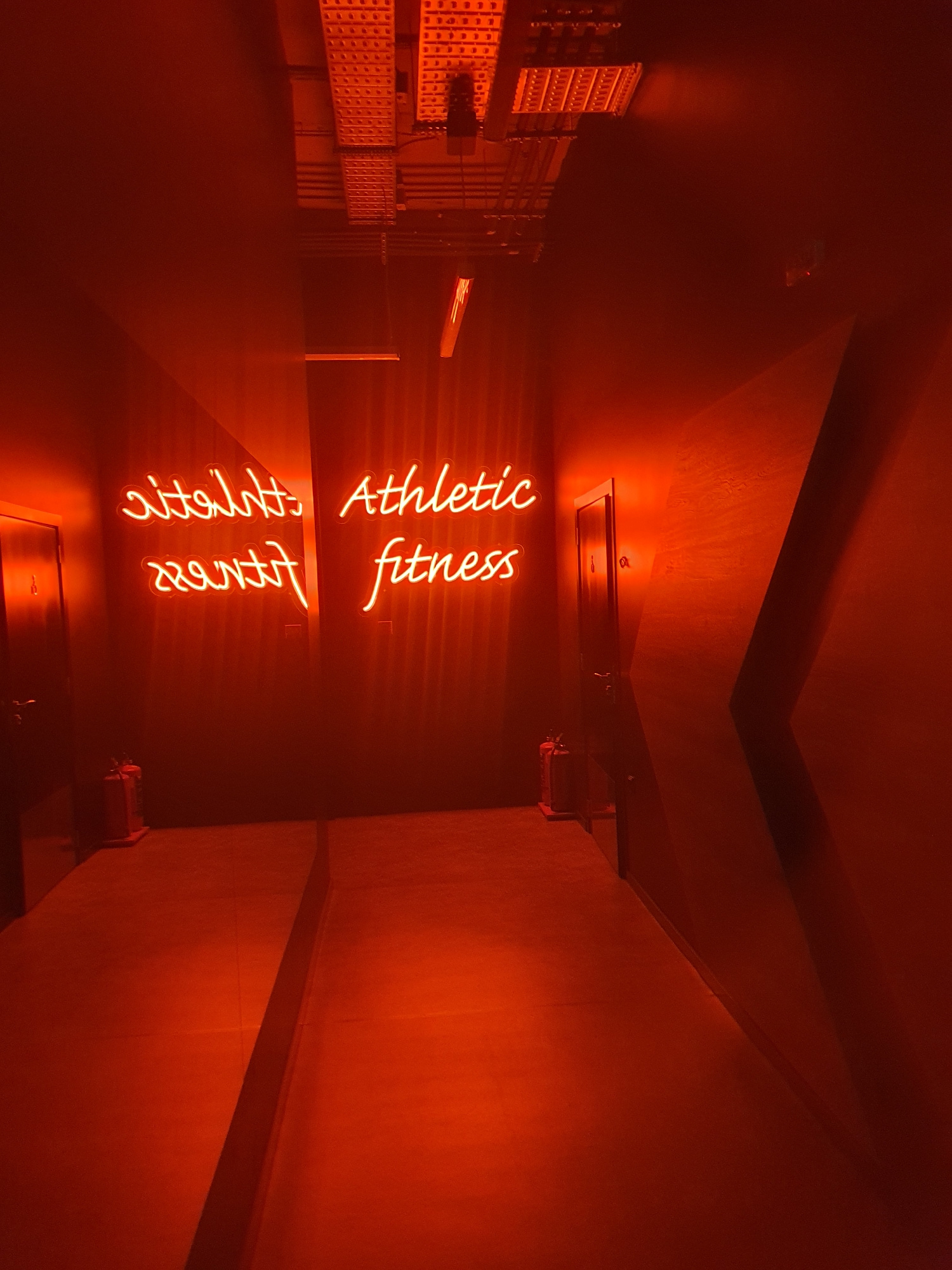 The image depicts the interior of a space with strong red lighting, possibly in Plovdiv, Bulgaria, though this cannot be definitively confirmed from the visual alone. The phrase "Athletic Fitness" isβ¦read more