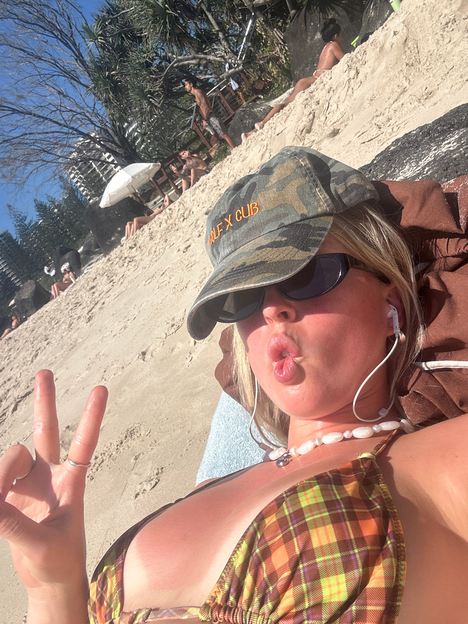 A woman in a bikini top and cap is lying on a sandy beach. The location is determined to be Coolangatta, Australia. The woman is wearing sunglasses, and the cap has orange lettering visible. She is we…read more