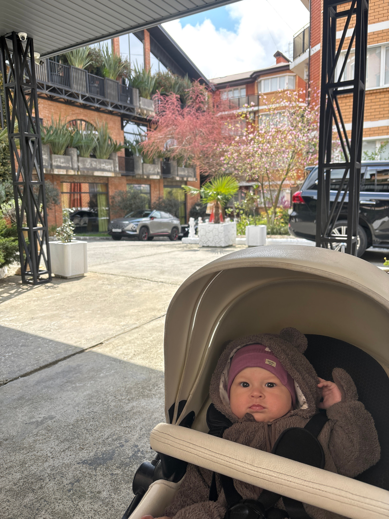 A baby wearing a brown fuzzy bear suit and a purple beanie is sitting in a beige stroller. The stroller is on a concrete surface. In the background, there are buildings with trees and greenery. A meta…read more