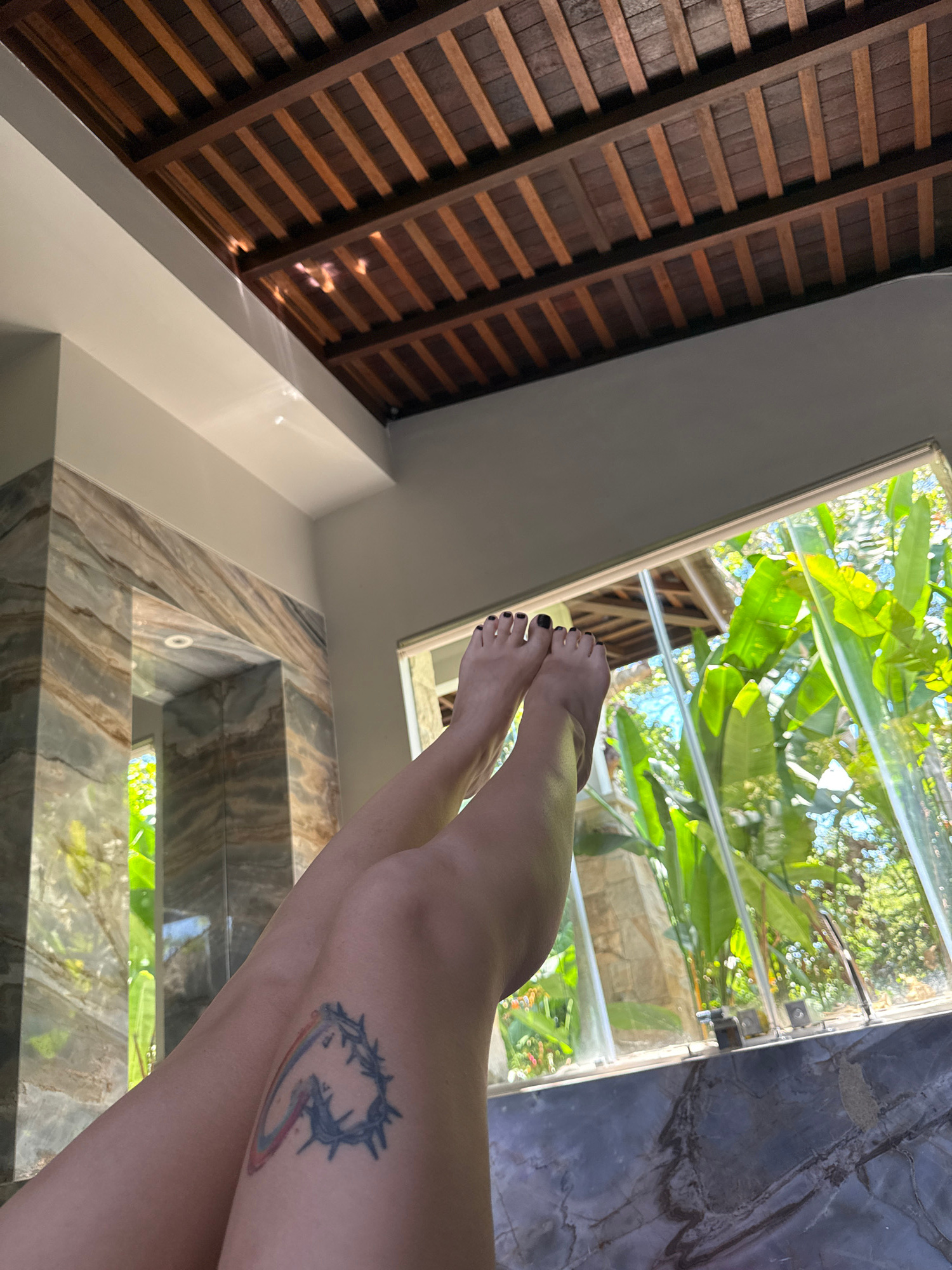 The image shows a low-angle view within a room, possibly a bathroom, in what is claimed to be North Kuta, Indonesia. A wooden ceiling with exposed beams is visible on the left side of the frame. The r…read more