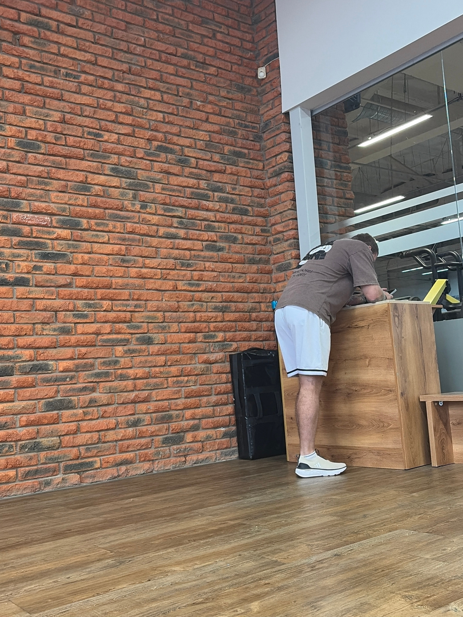 A vertically oriented photograph depicts a man indoors performing an exercise involving a wooden cabinet-like structure. The man wears a brown t-shirt and white athletic shorts with black trim. He is…read more