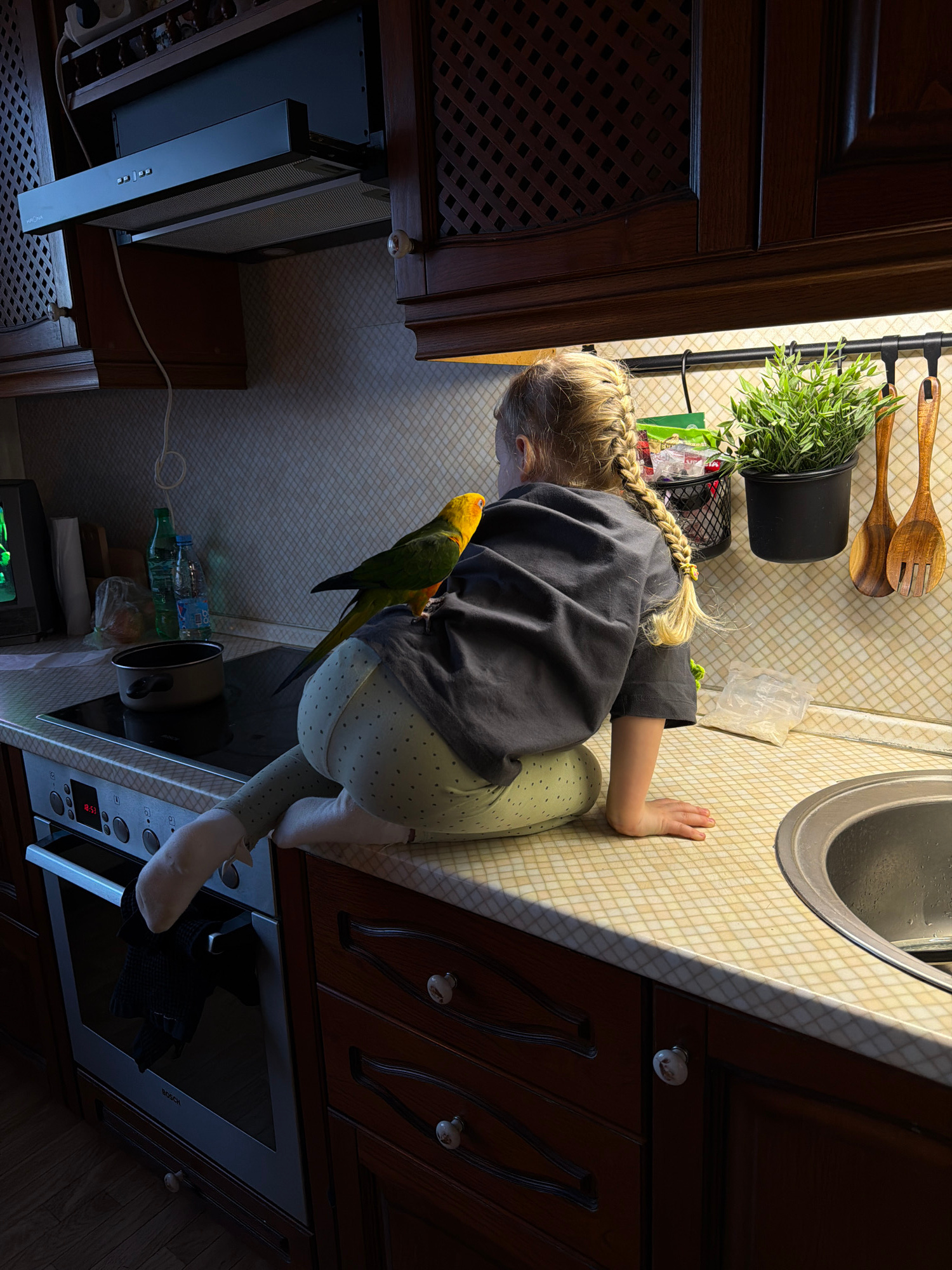 A young girl with blonde braided hair stands in a kitchen with light-colored tiled countertops, dark wooden cabinets, and appliances, including a sink, oven, and range hood. A yellow and green bird is…read more