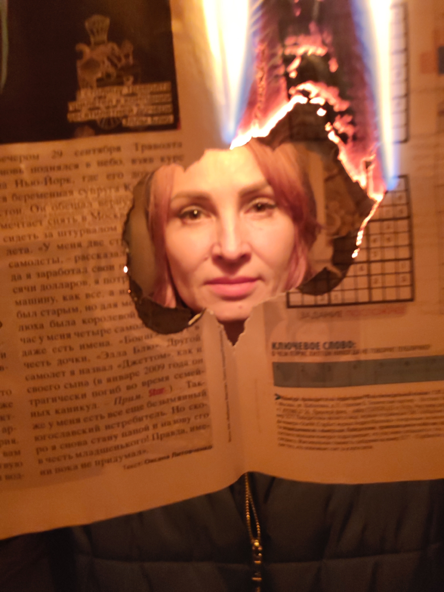 A woman's face is seen through a hole burned in a page of a newspaper. The edges of the hole are still aflame. The newspaper page is held up against a dark jacket. The article in the newspaper is in R…read more