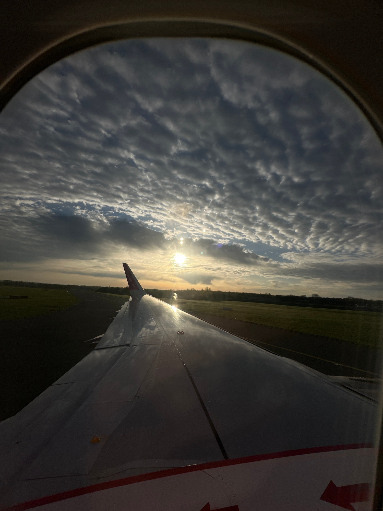The image shows a view from an airplane window, with the plane's wing visible. The sun is shining brightly, creating a lens flare, and partially obscured by patchy clouds. Below, the ground is visibleβ¦read more