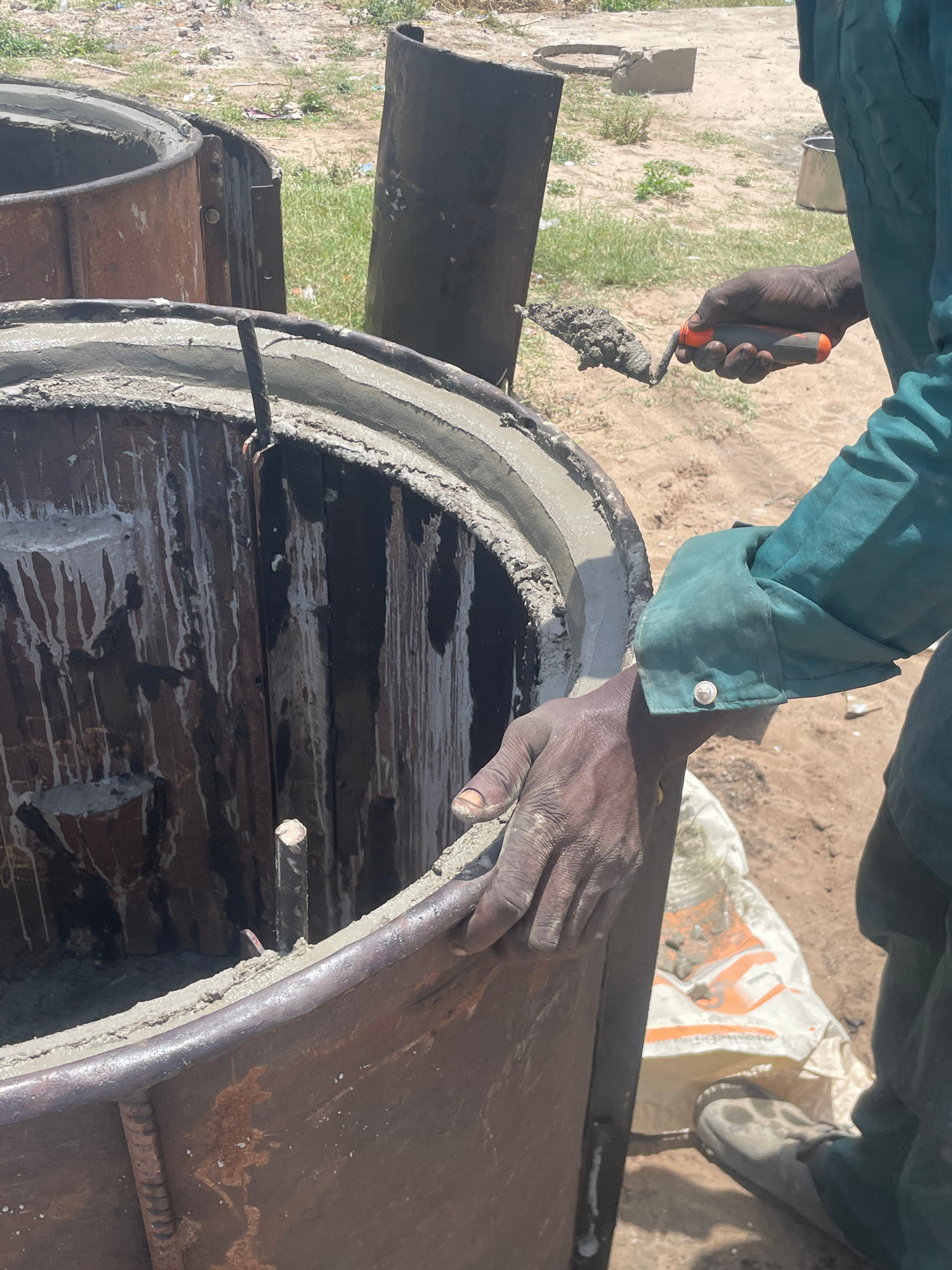 The image provides a high-angle, close-up view of a person engaged in construction work outdoors in Badagry, Nigeria. The scene is brightly lit by daylight, indicating clear weather. The primary subj…read more